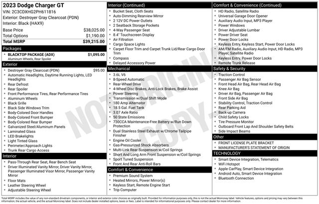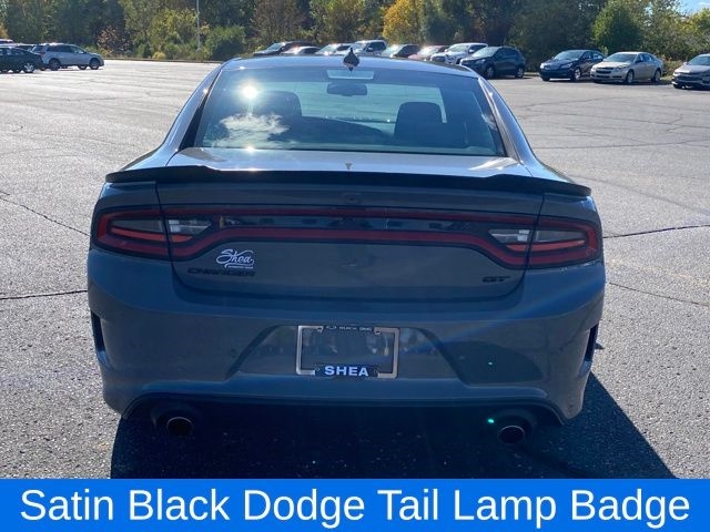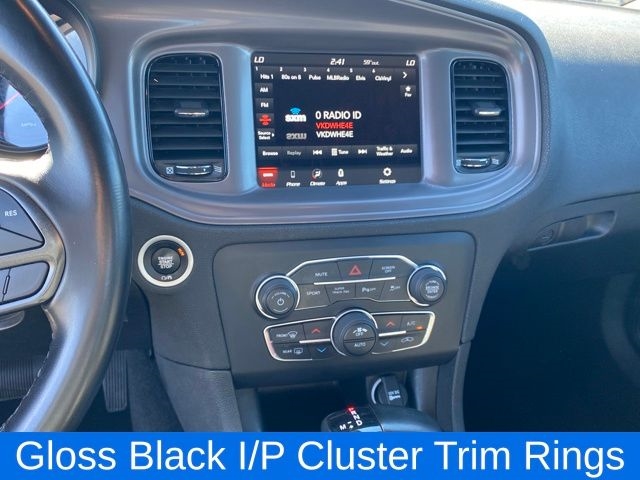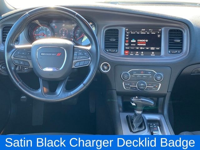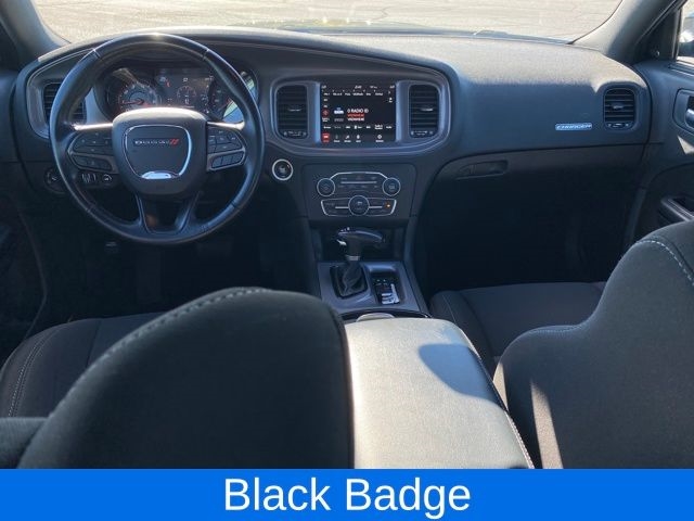 Black 1-Piece Performance Spoiler, Black Badge, Black Dodge Grille Badge, Blacktop Package, Gloss Black I/P Cluster Trim Rings, Rhombi 2-Pc Wheel Center Cap, Satin Black Charger Decklid Badge, Satin Black Dodge Tail Lamp Badge, Wheels: 20" x 8" Black Noise Painted, 1-Yr SiriusXM Guardian Trial, 2-Piece Shark Fin Antenna, 4-Wheel Disc Brakes, 4G LTE Wi-Fi Hot Spot, 6 Speakers, 8.4" Touchscreen Display, ABS brakes, Air Conditioning, Alloy wheels, AM/FM radio: SiriusXM, Anti-whiplash front head restraints, Apple CarPlay, Apple CarPlay/Android Auto, Auto-dimming Rear-View mirror, Automatic temperature control, Brake assist, Bumpers: body-color, Cloth Performance Seats, Compass, Delay-off headlights, Driver door bin, Driver vanity mirror, Dual front impact airbags, Dual front side impact airbags, Electronic Stability Control, Emergency communication system: SiriusXM Guardian, For Details, Visit DriveUconnect.com, Four wheel independent suspension, Front anti-roll bar, Front Bucket Seats, Front Center Armrest, Front dual zone A/C, Front License Plate Bracket, Front reading lights, Fully automatic headlights, Garage door transmitter: HomeLink, Google Android Auto, GPS Antenna Input, HD Radio, Heated door mirrors, Illuminated entry, Integrated Center Stack Radio, Integrated Voice Command w/Bluetooth, Knee airbag, Leather Shift Knob, Low tire pressure warning, Manufacturer's Statement of Origin, Media Hub (2 USB, AUX), Occupant sensing airbag, Outside temperature display, Overhead airbag, Overhead console, Panic alarm, ParkView Rear Back-Up Camera, Passenger door bin, Passenger vanity mirror, Power 2-Way Driver Lumbar Adjust, Power 8-Way Driver Seat, Power door mirrors, Power driver seat, Power steering, Power windows, Radio: Uconnect 4C w/8.4" Display, Rear anti-roll bar, Rear Armrest w/Cupholder Seat, Rear reading lights, Rear seat center armrest, Rear window defroster, Remote keyless entry, Speed control, Speed-Sensitive Wipers, Split folding rear seat, Spoiler, Steering wheel mounted audio controls, Tachometer, Telescoping steering wheel, Tilt steering wheel, Traction control, Trip computer, USB Host Flip, Variably intermittent wipers, Wheels: 20" x 8" Satin Carbon Painted, Black 1-Piece Performance Spoiler, Black Badge, Black Dodge Grille Badge, Blacktop Package, Gloss Black I/P Cluster Trim Rings, Rhombi 2-Pc Wheel Center Cap, Satin Black Charger Decklid Badge, Satin Black Dodge Tail Lamp Badge, Wheels: 20" x 8" Black Noise Painted.