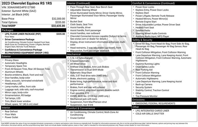 19" Aluminum Wheels, 2 Rear USB Charging-Only Ports, 2 USB Ports & Auxiliary Input Jack, 2-Way Power Driver Lumbar Control Seat Adjuster, 3.87 Final Drive Axle Ratio, 4-Wheel Disc Brakes, 6 Speakers, 6-Speaker Audio System Feature, ABS brakes, Air Conditioning, All-Weather Floor Liners (LPO), Alloy wheels, AM/FM radio: SiriusXM, Auto High-beam Headlights, Automatic temperature control, Bluetooth® For Phone, Brake assist, Bumpers: body-color, Cold Air Grille Shutter, Compass, Delay-off headlights, Driver 8-Way Power Seat Adjuster, Driver door bin, Driver vanity mirror, Dual front impact airbags, Dual front side impact airbags, Electronic Stability Control, Emergency communication system: OnStar and Chevrolet connected services capable, Floor Liner Package (LPO), Four wheel independent suspension, Front anti-roll bar, Front Bucket Seats, Front Center Armrest, Front dual zone A/C, Front Passenger 4-Way Manual Seat Adjuster, Front reading lights, Fully automatic headlights, Heated door mirrors, Heated Driver & Front Passenger Seats, Heated front seats, Illuminated entry, Integrated Cargo Liner (LPO), Low tire pressure warning, Occupant sensing airbag, Outside temperature display, Overhead airbag, Overhead console, Panic alarm, Passenger door bin, Passenger vanity mirror, Power door mirrors, Power driver seat, Power Liftgate, Power steering, Power windows, Preferred Equipment Group 1RS, Premium audio system: Chevrolet Infotainment 3, Premium Cloth Seat Trim, Radio data system, Radio: Chevrolet Infotainment 3 System w/AM/FM, Rear anti-roll bar, Rear reading lights, Rear seat center armrest, Rear window defroster, Rear window wiper, Remote keyless entry, Roof rack: rails only, Security system, SiriusXM Radio, Speed control, Speed-sensing steering, Split folding rear seat, Spoiler, Steering wheel mounted audio controls, Tachometer, Telescoping steering wheel, Tilt steering wheel, Traction control, Trip computer, Variably intermittent wipers, Wireless Apple CarPlay/Wireless Android Auto.