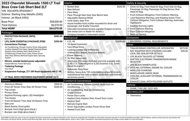 10-Way Power Driver Seat w/Lumbar, 120-Volt Instrument Panel Power Outlet, Convenience Package, Dual Rear USB Ports (Charge Only), Dual-Zone Automatic Climate Control, Electric Rear-Window Defogger, Heated Driver & Front Outboard Passenger Seats, Heated Steering Wheel, Keyless Open & Start, Remote Vehicle Starter System, Theft Deterrent System (Unauthorized Entry), Wrapped Steering Wheel, 12.3" Multicolor Reconfigurable Digital Display, 120-Volt Bed Mounted Power Outlet, 170 Amp Alternator, 2 USB Data Ports, 220 Amp Alternator, 3.23 Rear Axle Ratio, 3.42 Rear Axle Ratio, 4-Wheel Disc Brakes, 40/20/40 Front Split-Bench Seat, 6 Speakers, 6-Speaker Audio System, ABS brakes, Air Conditioning, All-Weather Floor Liner (LPO) (AAK), Alloy wheels, AM/FM radio: SiriusXM with 360L, Apple CarPlay/Android Auto, Auto High-beam Headlights, Auto-Locking Rear Differential, Automatic Emergency Braking, Automatic temperature control, Auxiliary External Transmission Oil Cooler, Black Name Plates (LPO), Black Tailgate CHEVROLET Lettering (LPO), Bluetooth® For Phone, Brake assist, Chevrolet Connected Access Capable, Chevytec Spray-On Black Bedliner, Cloth Seat Trim, Color-Keyed Carpeting Floor Covering, Compass, Dark Essentials Package (LPO), Deep-Tinted Glass, Delay-off headlights, Driver door bin, Driver vanity mirror, Dual Exhaust w/Polished Outlets, Dual front impact airbags, Dual front side impact airbags, Electrical Steering Column Lock, Electronic Cruise Control, Electronic Stability Control, Electronic Transmission Range Selector Shifter, External Engine Oil Cooler, EZ Lift Power Lock & Release Tailgate, Floor Mounted Center Console, Following Distance Indicator, Forward Collision Alert, Front anti-roll bar, Front Bucket Seats, Front Center Armrest w/Storage, Front dual zone A/C, Front fog lights, Front LED Fog Lamps, Front Pedestrian Braking, Front reading lights, Front wheel independent suspension, Fully automatic headlights, HD Rear Vision Camera, Heated door mirrors, Heated front seats, Heated Power-Adjustable Outside Mirrors, Heated steering wheel, Heavy-Duty Air Filter, High Gloss Black Mirror Caps, Hill Descent Control, Hitch Guidance, Illuminated entry, Inside Rear-View Mirror w/Tilt, Integrated Trailer Brake Controller, IntelliBeam Automatic High Beam On/Off, Lane Keep Assist w/Lane Departure Warning, LED Cargo Area Lighting, Low tire pressure warning, Not Equipped w/Steering Column Lock, Occupant sensing airbag, OnStar & Chevrolet Connected Services Capable, Outside temperature display, Overhead airbag, Overhead console, Panic alarm, Passenger door bin, Passenger vanity mirror, Performance Red Recovery Hooks, Power door mirrors, Power driver seat, Power Front Windows w/Driver Express Up/Down, Power Front Windows w/Passenger Express Down, Power Rear Windows w/Express Down, Power steering, Power windows, Preferred Equipment Group 2LT, Premium audio system: Chevrolet Infotainment 3 Premium, Protection Package, Radio data system, Radio: Chevrolet Infotainment 3 Premium System, Rear 60/40 Folding Bench Seat (Folds Up), Rear reading lights, Rear step bumper, Rear Wheelhouse Liners, Rear window defroster, Remote keyless entry, Security system, SiriusXM w/360L, Speed control, S