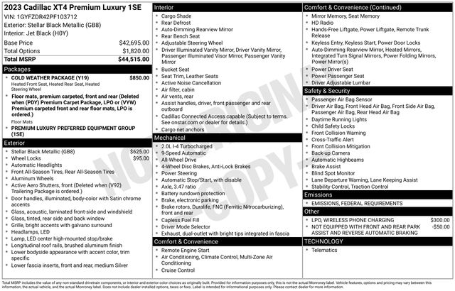 Cold Weather Package, Heated Driver & Front Passenger Seats, Heated Rear Outboard Seating Positions, Heated Steering Wheel, 2-Way Driver Seat Power Lumbar Control, 2-Way Passenger Seat Power Lumbar Control, 3.47 Axle Ratio, 4-Wheel Disc Brakes, 4.2" Diagonal Color Display Driver Info Center, 6-Way Power Passenger Seat Adjuster, 7 Speakers, 7-Speaker Audio System w/Auxiliary Amplifier, 8-Way Power Driver Seat Adjuster, ABS brakes, Air Conditioning, Alloy wheels, AM/FM radio: SiriusXM with 360L, Apple CarPlay/Android Auto, Auto High-beam Headlights, Auto-dimming door mirrors, Auto-Dimming Inside Rear-View Mirror, Auto-dimming Rear-View mirror, Automatic Emergency Braking, Automatic temperature control, Brake assist, Bumpers: body-color, Compass, Delay-off headlights, Driver door bin, Driver vanity mirror, Dual front impact airbags, Dual front side impact airbags, Electronic Cruise Control w/Set & Resume Speed, Electronic Stability Control, Emergency communication system: OnStar and Cadillac connected services capable, Four wheel independent suspension, Front & Rear Park Assist, Front anti-roll bar, Front Bucket Seats, Front Center Armrest, Front dual zone A/C, Front reading lights, Fully automatic headlights, Garage door transmitter, HD Radio, HD Rear Vision Camera, Heated door mirrors, Illuminated entry, Knee airbag, Leather Seating Surfaces, Leather steering wheel, Low tire pressure warning, Manual Rake & Telescoping Steering Column, Memory seat, Not Equipped w/Fr & Rr Pk Assist/Rev Auto Braking, Occupant sensing airbag, Outside temperature display, Overhead airbag, Overhead console, Panic alarm, Passenger door bin, Passenger vanity mirror, Power door mirrors, Power driver seat, Power Liftgate, Power passenger seat, Power steering, Power windows, Preferred Equipment Group 1SE, Radio data system, Radio: Cadillac User Experience AM/FM Stereo, Rain sensing wipers, Rear anti-roll bar, Rear reading lights, Rear seat center armrest, Rear window defroster, Rear window wiper, Remote keyless entry, Roof rack: rails only, Security system, SiriusXM w/360L, Speed control, Speed-sensing steering, Split folding rear seat, Spoiler, Standard Suspension, Steering wheel mounted audio controls, Tachometer, Telescoping steering wheel, Tilt steering wheel, Traction control, Trip computer, Turn signal indicator mirrors, Variably intermittent wipers, Voltmeter, Wheel Locks, Wheels: 18" 10-Spoke Pearl Nickel Finish Alloy, Wireless Apple CarPlay/Wireless Android Auto, Wireless Phone Charging (LPO), Cold Weather Package, Heated Driver & Front Passenger Seats, Heated Rear Outboard Seating Positions, Heated Steering Wheel.