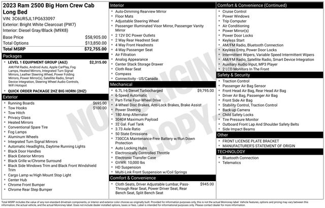 2nd Row In Floor Storage Bins, 4G LTE Wi-Fi Hot Spot, 8.4" Touchscreen Display, Apple CarPlay, Auto Power-Folding Mirrors, Big Horn IP Badge, Black Exterior Mirrors, Bluetooth Handsfree Phone & Audio, Connectivity - US/Canada, Dual Glove Boxes, Exterior Mirrors Courtesy Lamps, Exterior Mirrors w/Heating Element, Exterior Mirrors w/Supplemental Signals, Foam Bottle Insert (Door Trim Panel), Footwell Courtesy Lamp, For Details, Visit DriveUconnect.com, For More Info, Call 800-643-2112, Forward & Reverse Utility Lights, Front Fog Lamps, Global Telematics Box Module (TBM), Glove Box Lamp, Google Android Auto, GPS Antenna Input, Integrated Center Stack Radio, Integrated Voice Command w/Bluetooth, Leather Wrapped Steering Wheel, Level 1 Equipment Group, Locking Lower Glove Box, Mirror Running Lights, ParkView Rear Back-Up Camera, Power Adjust Mirrors, Power Adjustable Convex Aux Mirrors, Power Heated Fold Telescope Mirrors, Power Telescoping Mirrors, Premium Cloth 40/20/40 Bench Seat, Quick Order Package 2HZ Big Horn, Radio: Uconnect 5 W w/8.4" Display, Rear Dome w/On/Off Switch Lamp, Selectable Tire Fill Alert, SiriusXM Radio Service, SiriusXM Satellite Radio, Speed control, Steering Wheel Mounted Audio Controls, 2 Way Rear Headrest Seat, 3.73 Axle Ratio, 4 Way Front Headrests, 4-Wheel Disc Brakes, 40/20/40 Split Bench Seat, 6 Speakers, ABS brakes, Active Noise Control System, Air Conditioning, Alloy wheels, Auto-dimming Rear-View mirror, Brake assist, Bumpers: chrome, Center Hub, Center Stack Storage Drawer, Chrome Flat Cab-Length Side Steps, Cloth 40/20/40 Bench Seat, Compass, Delay-off headlights, Driver door bin, Dual front impact airbags, Dual front side impact airbags, Electronic Stability Control, Electronically Controlled Throttle, Emergency communication system: SiriusXM Guardian, Front anti-roll bar, Front Armrest w/Cupholders, Front Center Armrest w/Storage, Front Center Seat Cushion Storage, Front License Plate Bracket, Front reading lights, Front Seat Back Map Pockets, Fully automatic headlights, Heated door mirrors, Illuminated entry, Low tire pressure warning, Manual Adjust 4-Way Driver Seat, Manual Adjust 4-Way Front Passenger Seat, Manufacturer's Statement of Origin, Occupant sensing airbag, Outside temperature display, Overhead airbag, Overhead console, Panic alarm, Passenger door bin, Passenger vanity mirror, Power 2-Way Driver Lumbar Adjust, Power Adjust 8-Way Driver Seat, Power door mirrors, Power steering, Power windows, Radio data system, Radio: Uconnect 3 w/5" Display, Rear 60/40 Folding Seat, Rear anti-roll bar, Rear Folding Seat, Rear seat center armrest, Rear step bumper, Remote keyless entry, Storage Tray, Tachometer, Tilt steering wheel, Tip Start, Tow Hooks, Traction control, Trip computer, Turn signal indicator mirrors, Variably intermittent wipers, Voltmeter, Wheels: 18" x 8.0" Polished Aluminum, One Owner Clean Carfax, 6.7L CUMMINS TURBO DIESEL ENGINE, 2nd Row In Floor Storage Bins, 4G LTE Wi-Fi Hot Spot, 8.4" Touchscreen Display, Apple CarPlay, Auto Power-Folding Mirrors, Big Horn IP Badge, Black Exterior Mirrors, Bluetooth Handsfree Phone & Audio, Connectivity - US/Canada, Dual Glove Boxes, Exterior Mirrors Courtesy Lamps, Exterior Mirrors w/Heating Element, Exterior Mirrors w/