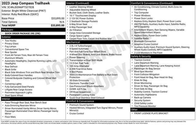 ParkView Rear Back-Up Camera, Quick Order Package 29E, Speed control, 10.1" Touchscreen Display, 4-Wheel Disc Brakes, 4.398 Final Drive Ratio, 6 Speakers, ABS brakes, Air Conditioning, Alloy wheels, AM/FM radio: SiriusXM, Auto High-beam Headlights, Auto-dimming Rear-View mirror, Automatic temperature control, Brake assist, Bumpers: body-color, Compass, Delay-off headlights, Disassociated Touchscreen Display, Driver door bin, Driver vanity mirror, Dual front impact airbags, Dual front side impact airbags, Electronic Stability Control, Four wheel independent suspension, Front anti-roll bar, Front Bucket Seats, Front Center Armrest w/Storage, Front dual zone A/C, Front fog lights, Front License Plate Bracket, Front reading lights, Fully automatic headlights, Heated door mirrors, Illuminated entry, Knee airbag, Leather Shift Knob, Low tire pressure warning, Occupant sensing airbag, Outside temperature display, Overhead airbag, Overhead console, Panic alarm, Passenger door bin, Passenger vanity mirror, Power door mirrors, Power steering, Power windows, Premium Cloth/Leather Trim Bucket Seats, Radio: Uconnect 5 w/10.1" Display, Rain sensing wipers, Rear anti-roll bar, Rear seat center armrest, Rear window defroster, Rear window wiper, Remote keyless entry, Security system, SiriusXM Radio Service, Split folding rear seat, Spoiler, Steering wheel mounted audio controls, Tachometer, Telescoping steering wheel, Tilt steering wheel, Traction control, Trip computer, Turn signal indicator mirrors, Variably intermittent wipers, Wheels: 17" x 6.5" Painted Black Aluminum, One Owner Clean Carfax, ParkView Rear Back-Up Camera, Quick Order Package 29E, Speed control.