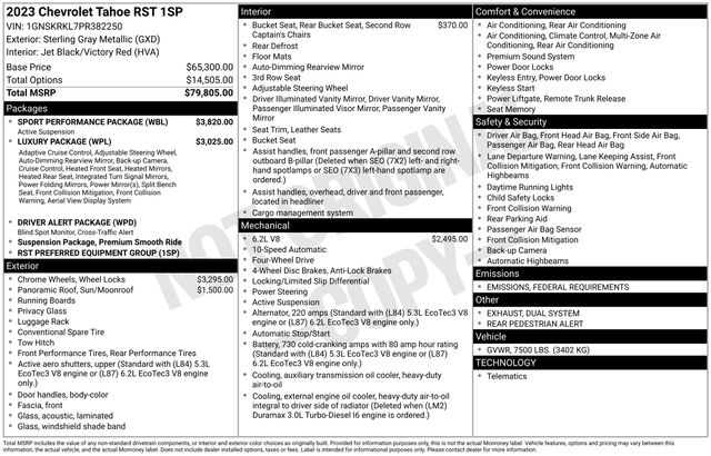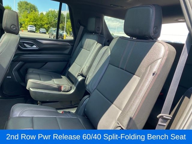 2nd Row Pwr Release 60/40 Split-Folding Bench Seat, 3rd Row 60/40 Power-Folding Split-Bench Seat, Adaptive Cruise Control, Driver Alert Package, Dual Exhaust System, Enhanced Automatic Emergency Braking, HD Surround Vision, Heated 2nd Row Outboard Seats, Heated Steering Wheel, Lane Change Alert w/Side Blind Zone Alert, Luxury Package, Magnetic Ride Control Suspension, Memory Settings, Navigation System, Outside Heated Power-Adjustable Mirrors, Power Tilt & Telescopic Steering Column, Rear Cross Traffic Alert, Rear Pedestrian Alert, Sport Performance Package, 10-Way Power Driver & Passenger Seat Adjusters, 1st & 2nd Row Color-Keyed Carpeted Floor Mats, 3.23 Rear Axle Ratio, 3rd row seats: split-bench, 4-Wheel Disc Brakes, 9 Speakers, ABS brakes, Air Conditioning, Alloy wheels, AM/FM radio: SiriusXM with 360L, Apple CarPlay/Android Auto, Auto High-beam Headlights, Auto-Dimming Inside Rear-View Mirror, Auto-dimming Rear-View mirror, Automatic temperature control, Bose 9-Speaker Stereo Audio System Feature, Brake assist, Bright Front & Rear Door Sill Plates, Bumpers: body-color, Color-Keyed Carpeting Floor Covering, Compass, Delay-off headlights, Driver & Front Outboard Passenger Airbags, Driver door bin, Driver vanity mirror, Dual front impact airbags, Dual front side impact airbags, Dual-Pane Power Panoramic Sunroof, Electronic Stability Control, Emergency communication system: OnStar and Chevrolet connected services capable, Enhanced Driver Information Center, Floor Console w/Storage Area, Four wheel independent suspension, Front anti-roll bar, Front Bucket Seats, Front Center Armrest, Front dual zone A/C, Front High-Back Reclining Bucket Seats, Front reading lights, Fully automatic headlights, Garage door transmitter, Hands-Free Rear Power Programmable Liftgate, Heated door mirrors, Heated Driver & Front Passenger Seats, Heated front seats, Illuminated entry, Infotainment Display, LED Daytime Running Lamps, Low tire pressure warning, Memory seat, Memory Settings for Driver, Occupant sensing airbag, Outside temperature display, Overhead airbag, Overhead console, Panic alarm, Passenger door bin, Passenger vanity mirror, Perforated Leather Seat Trim, Power door mirrors, Power driver seat, Power Liftgate, Power passenger seat, Power Release 2nd Row Bucket Seats, Power steering, Power windows, Preferred Equipment Group 1SP, Premium audio system: Chevrolet Infotainment 3 Premium, Premium Smooth Ride Suspension, Radio: Chevrolet Infotainment 3 Premium System, Rain sensing wipers, Rear air conditioning, Rear anti-roll bar, Rear reading lights, Rear seat center armrest, Rear window defroster, Rear window wiper, Remote keyless entry, Remote Start, Roof rack: rails only, Security system, Set of 4 Wheel Locks (LPO), SiriusXM Radio w/360L, Speed control, Speed-sensing steering, Split folding rear seat, Spoiler, Steering wheel mounted audio controls, Tachometer, Telescoping steering wheel, Tilt steering wheel, Traction control, Trip computer, Universal Home Remote, Variably intermittent wipers, Voltmeter, Wheels: 22" Multi-Spoke Gloss Black (LPO) (SRV), Wheels: 22" x 9" Bright Machined, Wheels: 22" x 9" Steel Interim (LPO), Wireless Charging, Wrapped Steering Wheel, 2nd Row Pwr Release 60/40 Split-Folding Bench Seat, 3rd Row 60/40 Power-Folding Split-Bench Seat, Adaptive Cruise Control, Driver Alert Package, Dual Exhaust System, Enhanced Automatic Emergency Braking, HD Surround Vision, Heated 2nd Row Outboard Seats, Heated Steering Wheel, Lane Change Alert w/Side Blind Zone Alert, Luxury Package, Magnetic Ride Control Suspension, Memory Settings, Navigation System, Outside Heated Power-Adjustable Mirrors, Power Tilt & Telescopic Steering Column, Rear Cross Traffic Alert, Rear Pedestrian Alert, Sport Performance Package.