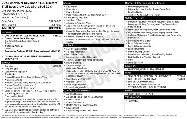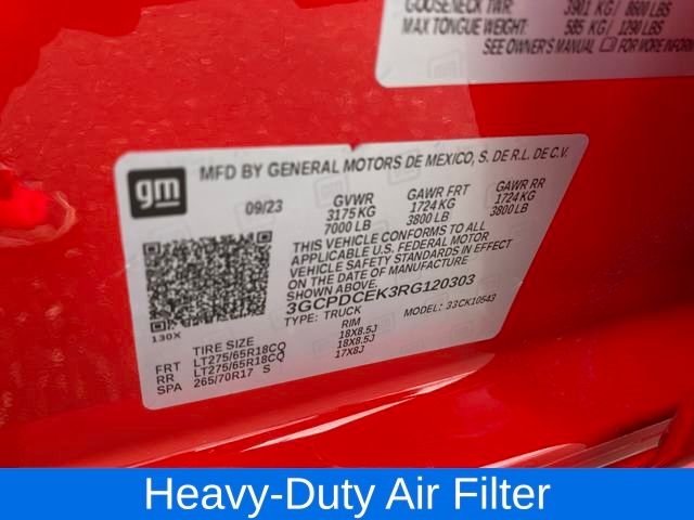 10-Way Power Driver Seat w/Lumbar, 120-Volt Interior Power Outlet, 3.5" Monochromatic Display Driver Info Center, Auto-Locking Rear Differential, Black Name Plates (LPO), Bluetooth® For Phone, Chevytec Spray-On Black Bedliner, Color-Keyed Carpeting Floor Covering, Custom Convenience Package, Dark Essentials Package (LPO), Deep-Tinted Glass, Dual Rear USB Ports (Charge Only), Electric Rear-Window Defogger, Electrical Steering Column Lock, Electronic Cruise Control, EZ Lift Power Lock & Release Tailgate, Front Rubberized Vinyl Floor Mats, HD Rear Vision Camera, Heavy-Duty Air Filter, Hill Descent Control, LED Cargo Area Lighting, Manual Tilt Wheel Steering Column, OnStar & Chevrolet Connected Services Capable, Performance Red Recovery Hooks, Power Front Windows w/Driver Express Up/Down, Power Front Windows w/Passenger Express Down, Power Rear Windows w/Express Down, Preferred Equipment Group 2CX, Rear 60/40 Folding Bench Seat (Folds Up), Rear Rubberized-Vinyl Floor Mats, Rear Wheelhouse Liners, Remote Keyless Entry, Remote Vehicle Starter System, SiriusXM Radio, Standard Tailgate, Suspension Package, Theft Deterrent System (Unauthorized Entry), Trailering Package, Wheels: 18" x 8.5" Black Painted Aluminum, 120-Volt Bed Mounted Power Outlet, 220 Amp Alternator, 3.42 Rear Axle Ratio, 4-Wheel Disc Brakes, 40/20/40 Front Split-Bench Seat, 6 Speakers, 6-Speaker Audio System, ABS brakes, Air Conditioning, Alloy wheels, AM/FM radio: SiriusXM, Auto High-beam Headlights, Automatic Emergency Braking, Black Tailgate CHEVROLET Lettering (LPO), Brake assist, Chevrolet Connected Access Capable, Cloth Seat Trim, Compass, Delay-off headlights, Driver door bin, Driver vanity mirror, Dual front impact airbags, Dual front side impact airbags, Electronic Stability Control, Following Distance Indicator, Forward Collision Alert, Front anti-roll bar, Front Center Armrest w/Storage, Front Pedestrian Braking, Front reading lights, Front wheel independent suspension, Fully automatic headlights, Heated door mirrors, Hitch Guidance, Illuminated entry, Integrated Trailer Brake Controller, IntelliBeam Automatic High Beam On/Off, Lane Keep Assist w/Lane Departure Warning, Low tire pressure warning, Occupant sensing airbag, Outside temperature display, Overhead airbag, Overhead console, Panic alarm, Passenger door bin, Passenger vanity mirror, Power door mirrors, Power driver seat, Power steering, Power windows, Premium audio system: Chevrolet Infotainment 3, Radio data system, Radio: Chevrolet Infotainment 3 System, Rear reading lights, Rear step bumper, Rear window defroster, Remote keyless entry, Security system, Single Outlet Exhaust, Speed control, Speed-sensing steering, Split folding rear seat, Tachometer, Tilt steering wheel, Traction control, Trip computer, Variably intermittent wipers, Voltmeter, Wi-Fi Hot Spot Capable, One Owner Clean Carfax, TURBOMAX ENGINE, 10-Way Power Driver Seat w/Lumbar, 120-Volt Interior Power Outlet, 3.5" Monochromatic Display Driver Info Center, Auto-Locking Rear Differential, Black Name Plates (LPO), Bluetooth® For Phone, Chevytec Spray-On Black Bedliner, Color-Keyed Carpeting Floor Covering, Custom Convenience Package, Dark Essentials Package (LPO), Deep-Tinte