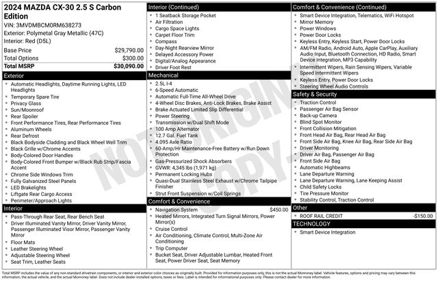 4-Wheel Disc Brakes, 4.095 Axle Ratio, 8 Speakers, ABS brakes, Air Conditioning, Alloy wheels, AM/FM radio, AppLink/Apple CarPlay and Android Auto, Auto High-beam Headlights, Automatic temperature control, Brake assist, Bumpers: body-color, Compass, Delay-off headlights, Driver door bin, Driver vanity mirror, Dual front impact airbags, Dual front side impact airbags, Electronic Stability Control, Emergency communication system: Mazda Connected Services (3-year complimentary trial included), Exterior Parking Camera Rear, Front anti-roll bar, Front Bucket Seats, Front Center Armrest, Front dual zone A/C, Front reading lights, Front wheel independent suspension, Fully automatic headlights, Heated door mirrors, Heated Front Bucket Seats, Heated front seats, Illuminated entry, Knee airbag, Leather Seat Trim, Leather Shift Knob, Leather steering wheel, Low tire pressure warning, MAZDA CONNECT Infotainment System, Mazda Navigation System, Memory seat, Occupant sensing airbag, Outside temperature display, Overhead airbag, Overhead console, Panic alarm, Passenger door bin, Passenger vanity mirror, Power door mirrors, Power driver seat, Power moonroof, Power steering, Power windows, Radio data system, Radio: AM/FM/HD Audio System, Rain sensing wipers, Rear seat center armrest, Rear side impact airbag, Rear window defroster, Rear window wiper, Remote keyless entry, Roof Rail Credit, Speed control, Speed-sensing steering, Split folding rear seat, Spoiler, Steering wheel mounted audio controls, Tachometer, Telescoping steering wheel, Tilt steering wheel, Traction control, Trip computer, Turn signal indicator mirrors, Variably intermittent wipers, Wheels: 18" x 7J Aluminum Alloy.