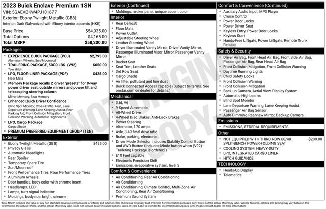1st & 2nd Row All-Weather Floor Liners (LPO), 20" Polished Aluminum Wheels, 2nd Row Heated Outboard Seats, 3rd Row All-Weather Floor Liner (LPO), 5000lbs Trailering Package, Experience Buick Package, Exterior Parking Camera Rear, Floor Liner Package (LPO), Front & Rear Park Assist, Front Power Sliding Moonroof, Heated Driver & Front Passenger Seats, Heated Steering Wheel, Heavy-Duty Cooling System, Hitch Guidance, Hitch Guidance w/Hitch View, Integrated Cargo Liner (LPO), Perforated Leather-Appointed Seat Trim, Power Liftgate, Preferred Equipment Group 1SN, Speed control, 10 Speakers, 18" Aluminum Wheels, 3.49 Axle Ratio, 3rd row seats: split-bench, 4-Wheel Disc Brakes, 6-Way Power Front Passenger Seat Adjuster, 7-Passenger Seating, 8-Way Power Driver Seat Adjuster, ABS brakes, Air Conditioning, Alloy wheels, AM/FM radio: SiriusXM with 360L, Auto High-beam Headlights, Auto-dimming door mirrors, Auto-dimming Rear-View mirror, Automatic temperature control, Bose Performance-Enhanced 10-Speaker System, Brake assist, Bumpers: body-color, Compass, Delay-off headlights, Driver 4-Way Power Lumbar Seat Adjuster, Driver door bin, Driver vanity mirror, Dual front impact airbags, Dual front side impact airbags, Electronic Stability Control, Emergency communication system: OnStar and Buick connected services capable, Four wheel independent suspension, Front anti-roll bar, Front Bucket Seats, Front Center Armrest, Front dual zone A/C, Front Passenger 4-Way Power Lumbar Seat Adjuster, Front reading lights, Fully automatic headlights, Garage door transmitter, Heads-Up Display, Heated door mirrors, Heated front seats, Heated rear seats, Heated steering wheel, Illuminated entry, Leather steering wheel, Low tire pressure warning, Memory Package, Memory seat, Navigation System, Not Equipped w/3rd Row 60/40 Power-Folding Seat, Occupant sensing airbag, Outside temperature display, Overhead airbag, Overhead console, Panic alarm, Passenger door bin, Passenger vanity mirror, Power door mirrors, Power driver seat, Power passenger seat, Power steering, Power windows, Premium audio system: Buick Infotainment System, Radio data system, Radio: Buick Infotainment Sys AM/FM Stereo w/Nav, Rear air conditioning, Rear anti-roll bar, Rear reading lights, Rear window defroster, Rear window wiper, Remote keyless entry, Roof rack: rails only, Security system, SiriusXM w/360L, Speed-sensing steering, Spoiler, Steering wheel memory, Steering wheel mounted audio controls, Tachometer, Telescoping steering wheel, Tilt steering wheel, Traction control, Trip computer, Turn signal indicator mirrors, Variably intermittent wipers, Ventilated Driver & Front Passenger Seats, Ventilated front seats, Voltmeter, Wireless Apple CarPlay/Wireless Android Auto, One Owner Clean Carfax, ALL WHEEL DRIVE, 1st & 2nd Row All-Weather Floor Liners (LPO), 20" Polished Aluminum Wheels, 2nd Row Heated Outboard Seats, 3rd Row All-Weather Floor Liner (LPO), 5000lbs Trailering Package, Experience Buick Package, Exterior Parking Camera Rear, Floor Liner Package (LPO), Front & Rear Park Assist, Front Power Sliding Moonroof, Heated Driver & Front Passenger Seats, Heated Steering Wheel, Heavy-Duty Cooling System, Hitch Guidance, Hitch Guida