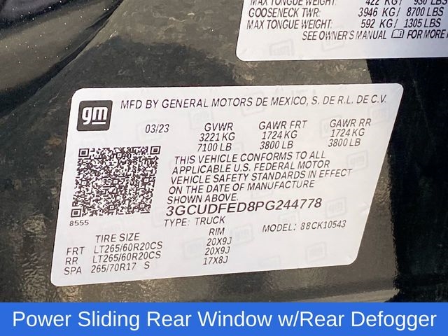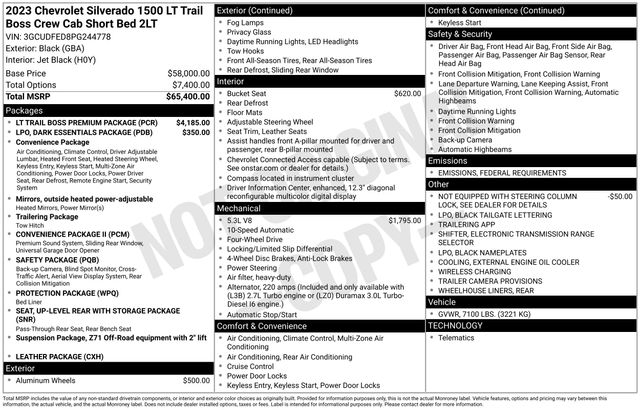 10-Way Power Driver Seat w/Lumbar, 120-Volt Instrument Panel Power Outlet, All-Weather Floor Liner (LPO) (AAK), Apple CarPlay/Android Auto, Black Name Plates (LPO), Convenience Package, Convenience Package II, Dark Essentials Package (LPO), Dual Rear USB Ports (Charge Only), Dual-Zone Automatic Climate Control, Electric Rear-Window Defogger, Heated Driver & Front Outboard Passenger Seats, Heated Steering Wheel, Hitch Guidance, Hitch Guidance w/Hitch View, Integrated Trailer Brake Controller, Keyless Open & Start, Leather Package, LT Trail Boss Premium Package, Power Sliding Rear Window w/Rear Defogger, Power Tailgate, Premium Bose 7-Speaker Sound System, Protection Package, Remote Vehicle Starter System, Safety Package, Speed control, Theft Deterrent System (Unauthorized Entry), Trailering App, Trailering Package, Universal Home Remote, Wrapped Steering Wheel, 12.3" Multicolor Reconfigurable Digital Display, 120-Volt Bed Mounted Power Outlet, 170 Amp Alternator, 2 USB Data Ports, 220 Amp Alternator, 3.23 Rear Axle Ratio, 3.42 Rear Axle Ratio, 4-Wheel Disc Brakes, 40/20/40 Front Split-Bench Seat, 6 Speakers, 6-Speaker Audio System, ABS brakes, Air Conditioning, Alloy wheels, AM/FM radio: SiriusXM with 360L, Auto High-beam Headlights, Auto-Locking Rear Differential, Automatic Emergency Braking, Automatic temperature control, Auxiliary External Transmission Oil Cooler, Black Tailgate CHEVROLET Lettering (LPO), Bluetooth® For Phone, Brake assist, Chevrolet Connected Access Capable, Chevytec Spray-On Black Bedliner, Cloth Seat Trim, Color-Keyed Carpeting Floor Covering, Compass, Deep-Tinted Glass, Delay-off headlights, Driver door bin, Driver vanity mirror, Dual Exhaust w/Polished Outlets, Dual front impact airbags, Dual front side impact airbags, Electrical Steering Column Lock, Electronic Cruise Control, Electronic Stability Control, Electronic Transmission Range Selector Shifter, External Engine Oil Cooler, EZ Lift Power Lock & Release Tailgate, Floor Mounted Center Console, Following Distance Indicator, Forward Collision Alert, Front anti-roll bar, Front Bucket Seats, Front Center Armrest w/Storage, Front dual zone A/C, Front fog lights, Front LED Fog Lamps, Front Pedestrian Braking, Front reading lights, Front wheel independent suspension, Fully automatic headlights, HD Rear Vision Camera, HD Surround Vision, Heated door mirrors, Heated front seats, Heated Power-Adjustable Outside Mirrors, Heated steering wheel, Heavy-Duty Air Filter, High Gloss Black Mirror Caps, Hill Descent Control, Illuminated entry, Inside Rear-View Mirror w/Tilt, IntelliBeam Automatic High Beam On/Off, Lane Keep Assist w/Lane Departure Warning, Leather-Appointed Front Seat Trim, LED Cargo Area Lighting, Low tire pressure warning, Not Equipped w/Steering Column Lock, Occupant sensing airbag, OnStar & Chevrolet Connected Services Capable, Outside temperature display, Overhead airbag, Overhead console, Panic alarm, Passenger door bin, Passenger vanity mirror, Performance Red Recovery Hooks, Perimeter Lighting, Power door mirrors, Power driver seat, Power Front Windows w/Driver Express Up/Down, Power Front Windows w/Passenger Express Down, Power Rear Windows w/Express Down, Power steering, Power windows, Preferred Equipment Group 2LT, Pr