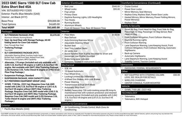 20" Polished Aluminum Wheels, Apple CarPlay/Android Auto, Chrome Wheel To Wheel Assist Steps, Floor-Mounted Center Console, Front Bucket Seats, HD Rear Vision Camera, Hitch Guidance, Navigation System, Power Rake & Telescoping Steering Column, Premium Bose 7-Speaker Sound System, SLT Convenience Package, SLT Premium Package, Speed control, Spray-On Pickup Bed Liner w/GMC Logo, Trailering Package, Ventilated Driver & Front Passenger Seats, Wireless Charging, 10-Way Power Driver Seat Adjuster w/Lumbar, 10-Way Power Passenger Seat Adjuster w/Lumbar, 120-Volt Bed Mounted Power Outlet, 120-Volt Instrument Panel Power Outlet, 170 Amp Alternator, 2 Charge/Data USB Ports, 2 Charge/Data USB Ports Inside Center Console, 2 Type-C Charge-Only Rear USB Ports, 3.23 Rear Axle Ratio, 4-Wheel Disc Brakes, 6 Speakers, 6-Speaker Audio System Feature, ABS brakes, Air Conditioning, Alloy wheels, AM/FM radio, Auto High-beam Headlights, Auto-dimming door mirrors, Auto-dimming Rear-View mirror, Auto-Locking Rear Differential, Automatic Emergency Braking, Automatic temperature control, Auxiliary External Transmission Oil Cooler, Brake assist, Buckle to Drive, Bumpers: chrome, Chrome Header & Chrome Grille Insert Bars, Color-Keyed Carpeting Floor Covering, Compass, Deep-Tinted Glass, Delay-off headlights, Driver door bin, Driver Memory, Driver vanity mirror, Dual front impact airbags, Dual front side impact airbags, Electric Rear-Window Defogger, Electrical Steering Column Lock, Electronic Precision Shift, Electronic Stability Control, Emergency communication system: OnStar and GMC connected services capable, Following Distance Indicator, Forward Collision Alert, Front 40/20/40 Split-Bench Seat, Front anti-roll bar, Front Center Armrest w/Storage, Front dual zone A/C, Front fog lights, Front Frame-Mounted Black Recovery Hooks, Front Pedestrian Braking, Front Prem Floor Liners w/Removable Carpet Insert, Front Rainsensing Wipers, Front reading lights, Front wheel independent suspension, Fully automatic headlights, GMC Connected Access Capable, Heated door mirrors, Heated Driver & Front Outboard Passenger Seating, Heated front seats, Heated steering wheel, High Capacity Suspension Package, Illuminated entry, IntelliBeam Automatic High Beam On/Off, Keyless Open & Start, Lane Keep Assist w/Lane Departure Warning, LED Cargo Area Lighting, Low tire pressure warning, Manual Tilt-Wheel & Telescoping Steering Column, Memory seat, Not Equipped w/Steering Column Lock, Occupant sensing airbag, OnStar & GMC Connected Services Capable, Outside temperature display, Overhead airbag, Overhead console, Panic alarm, Passenger door bin, Passenger vanity mirror, Perf Leather-Appointed Front Outboard Seat Trim, Perimeter Lighting, Power Door Locks, Power door mirrors, Power driver seat, Power Front Passenger Windows w/Express Up/Down, Power Front Windows w/Driver Express Up/Down, Power passenger seat, Power Rear Windows w/Express Down, Power steering, Power windows, Preferred Equipment Group 4SA, Premium audio system: GMC Infotainment System, Push Button Start, Radio data system, Radio: Premium GMC Infotainment Audio System, Rain sensing wipers, Rear Prem Floor Liners w/Removable Carpet Insert, Rear reading lights, Rear seat center armrest, Rear step bump