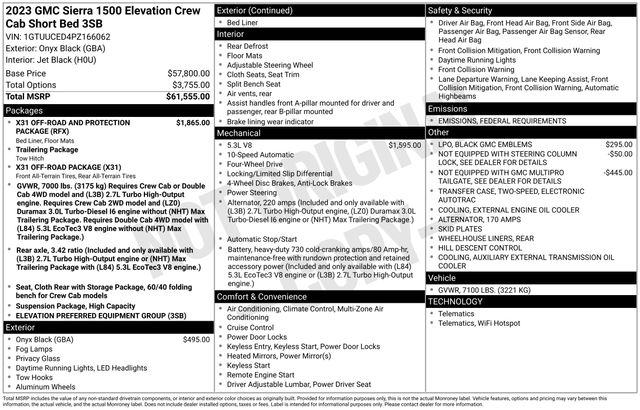 Navigation System, 10-Way Power Driver Seat Adjuster w/Lumbar, 120-Volt Bed Mounted Power Outlet, 120-Volt Instrument Panel Power Outlet, 170 Amp Alternator, 2 Charge/Data USB Ports, 2 Type-C Charge-Only Rear USB Ports, 220 Amp Alternator, 4-Way Manual Passenger Seat Adjuster, 4-Wheel Disc Brakes, 6 Speakers, 6-Speaker Audio System Feature, ABS brakes, Air Conditioning, All-Weather Floor Liner (LPO), Alloy wheels, AM/FM radio, Apple CarPlay/Android Auto, Auto High-beam Headlights, Auto-Locking Rear Differential, Automatic Emergency Braking, Automatic temperature control, Auxiliary External Transmission Oil Cooler, Black GMC Emblems (LPO), Body Color Header w/Gloss Black Mesh Grille Bars, Brake assist, Buckle to Drive, Bumpers: body-color, Cloth Rear Seat w/Storage Package, Cloth Seat Trim, Color-Keyed Carpeting Floor Covering, Compass, Deep-Tinted Glass, Delay-off headlights, Driver door bin, Driver vanity mirror, Dual Exhaust System, Dual front impact airbags, Dual front side impact airbags, Electric Rear-Window Defogger, Electrical Steering Column Lock, Electronic Stability Control, Emergency communication system: OnStar and GMC connected services capable, External Engine Oil Cooling, Following Distance Indicator, Forward Collision Alert, Front 40/20/40 Split-Bench Seat, Front anti-roll bar, Front Center Armrest w/Storage, Front dual zone A/C, Front fog lights, Front Frame-Mounted Black Recovery Hooks, Front Pedestrian Braking, Front reading lights, Front Rubberized-Vinyl Floor Mats, Front wheel independent suspension, Fully automatic headlights, GMC Connected Access Capable, HD Rear Vision Camera, Heated door mirrors, Heated Driver & Front Outboard Passenger Seating, Heated front seats, Heated steering wheel, Heavy-Duty Air Filter, High Capacity Suspension Package, Hill Descent Control, Hitch Guidance, Illuminated entry, IntelliBeam Automatic High Beam On/Off, Keyless Open & Start, Lane Keep Assist w/Lane Departure Warning, LED Cargo Area Lighting, Low tire pressure warning, Manual Tilt-Wheel & Telescoping Steering Column, Not Equipped w/Steering Column Lock, Not Equipped with GMC MultiPro Tailgate, Occupant sensing airbag, Off-Road Suspension, OnStar & GMC Connected Services Capable, Outside temperature display, Overhead airbag, Overhead console, Panic alarm, Passenger door bin, Passenger vanity mirror, Power Door Locks, Power door mirrors, Power driver seat, Power Front Windows w/Driver Express Up/Down, Power Front Windows w/Passenger Express Down, Power Rear Windows w/Express Down, Power steering, Power windows, Preferred Equipment Group 3SB, Premium audio system: GMC Infotainment System, Push Button Start, Radio data system, Radio: Premium GMC Infotainment Audio System, Rear reading lights, Rear Rubberized-Vinyl Floor Mats, Rear seat center armrest, Rear step bumper, Rear Wheelhouse Liners, Rear window defroster, Remote keyless entry, Remote Vehicle Starter System, Security system, SiriusXM w/360L, Speed control, Speed-sensing steering, Split folding rear seat, Spray-On Pickup Bed Liner w/GMC Logo, Standard Tailgate, Steering Wheel Audio Controls, Steering wheel mounted audio controls, Tachometer, Telescoping steering wheel, Theft Deterrent System (Unauthorized Entry), Tilt steering wheel, Traction c