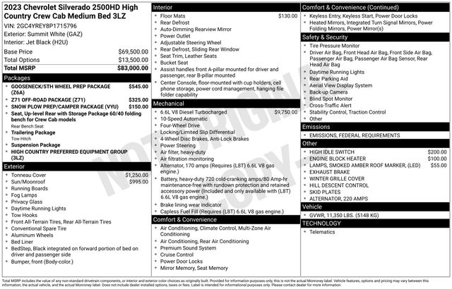 12-Volt Rear Auxiliary Power Outlet, 120-Volt Bed Mounted Power Outlet, 120-Volt Instrument Panel Power Outlet, 170 Amp Alternator, 220 Amp Alternator, 3.42 Rear Axle Ratio, 6" Rectangular Chromed Tubular Assist Steps, 8" Driver Information Center, Advanced Trailering System, All-Weather Floor Liners (LPO), Apple CarPlay/Android Auto, Auto-Dimming Inside Rear-View Mirror, Bed View Camera w/2 Trailer Camera Provisions, Black Chevytec Spray-On Bedliner, Bluetooth® For Phone, Brake assist, Chevrolet Connected Access Capable, Chrome Front Grille, Chrome Mirror Caps, Color-Keyed Carpeting Floor Covering, Compass, Deep-Tinted Glass, Dual Charge-Only USB Ports (2nd Row), Electric Rear-Window Defogger, Electrical Lock Control Steering Column, Electronic Cruise Control w/Set & Resume Speed, Electronic Stability Control, Exhaust Brake, Exterior Parking Camera Rear, Front Carpeted Floor Mats, Front Chrome Recovery Hooks, Front LED Fog Lamps, Gooseneck/5th Wheel Prep Package, HD Surround Vision w/2 Trailer View Camera Provisions, Heated & Auto-Dim Pwr Vertical Trailering Mirrors, Heated 2nd Row Outboard Seats, Heated Steering Wheel, High Idle Switch, Hill Descent Control, Hitch Guidance w/Hitch View, Hitch Package (LPO), Integrated Trailer Brake Controller, Keyless Open & Start, Lane Change Alert w/Side Blind Zone Alert, LED Cargo Area Lighting, Manual Tilt & Telescoping Steering Column, Off-Road Suspension, OnStar & Chevrolet Connected Services Capable, Polished Exhaust Tip, Power Door Locks, Power Front Windows w/Driver Express Up/Down, Power Front Windows w/Passenger Express Up/Down, Power Rear Windows w/Express Down, Power Sliding Rear Window w/Defogger, Power Sunroof, Preferred Equipment Group 3LZ, Rear Carpeted Floor Mats, Rear Cross Traffic Alert, Rear Wheelhouse Liners, Remote Vehicle Starter System, SiriusXM w/360L, Snow Plow Prep/Camper Package, Speed control, Standard Tailgate, Steering Wheel Audio Controls, Ultrasonic Front & Rear Park Assist, Unauthorized Entry Theft-Deterrent System, Universal Home Remote, Up-Level Rear Seat w/Storage Package, Ventilated Driver & Front Passenger Seats, Wheels: 20" 16-Spoke Polished Aluminum, Wi-Fi Hotspot Capable, Wireless Charging, Wireless Phone Projection, Wrapped Steering Wheel, Z71 Off-Road Package, 10-Way Power Driver Seat Adjuster w/Lumbar, 10-Way Power Passenger Seat Adjuster w/Lumbar, 4-Wheel Disc Brakes, 7 Speakers, 720 Cold-Cranking Amps Heavy-Duty Battery, ABS brakes, Air Conditioning, Alloy wheels, AM/FM radio: SiriusXM with 360L, Auto-dimming door mirrors, Auto-dimming Rear-View mirror, Automatic temperature control, BOSE Premium 7-Speaker Sound System, Bumpers: body-color, Delay-off headlights, Driver door bin, Driver Memory, Driver vanity mirror, Dual front impact airbags, Dual front side impact airbags, Engine Block Heater, Floor Liners w/Front Removable Carpet Inserts, Floor Liners w/Rear Removable Carpet Inserts, Floor-Mounted Center Console, Front anti-roll bar, Front Bucket Seats, Front Center Armrest, Front dual zone A/C, Front fog lights, Front reading lights, Front wheel independent suspension, Fully automatic headlights, Garage door transmitter, Hard-Folding Tonneau Cover (LPO), Heated door mirrors, Heated Driver & Front Outboard Passenger Seating, Heated front seats, Heated rear seats, Heated steering wheel, Illuminated entry, LED Smoked Amber Roof Marker Lamps, Low tire pressure warning, Memory seat, Navigation System, Occupant sensing airbag, Outside temperature display, Overhead airbag, Overhead console, Panic alarm, Passenger door bin, Passenger vanity mirror, Perforated Leather-Appointed Seat Trim, Power door mirrors, Power driver seat, Power passenger seat, Power steering, Power windows, Premium audio system: Chevrolet Infotainment 3 Premium, Radio: Chevr