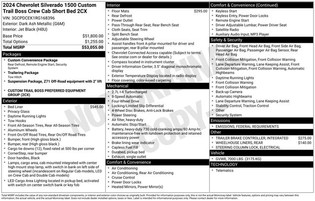 Custom Convenience Package, Electric Rear-Window Defogger, EZ Lift Power Lock & Release Tailgate, Hitch Guidance, LED Cargo Area Lighting, Remote Vehicle Starter System, Theft Deterrent System (Unauthorized Entry), Trailering Package, 10-Way Power Driver Seat w/Lumbar, 120-Volt Bed Mounted Power Outlet, 120-Volt Interior Power Outlet, 220 Amp Alternator, 3.42 Rear Axle Ratio, 3.5" Monochromatic Display Driver Info Center, 4-Wheel Disc Brakes, 40/20/40 Front Split-Bench Seat, 6 Speakers, 6-Speaker Audio System, ABS brakes, Air Conditioning, All-Weather Floor Liner (LPO) (AAK), Alloy wheels, AM/FM radio: SiriusXM, Auto High-beam Headlights, Auto-Locking Rear Differential, Automatic Emergency Braking, Bluetooth® For Phone, Brake assist, Chevrolet Connected Access Capable, Chevytec Spray-On Black Bedliner, Cloth Seat Trim, Color-Keyed Carpeting Floor Covering, Compass, Deep-Tinted Glass, Delay-off headlights, Driver door bin, Driver vanity mirror, Dual front impact airbags, Dual front side impact airbags, Dual Rear USB Ports (Charge Only), Electrical Steering Column Lock, Electronic Cruise Control, Electronic Stability Control, Following Distance Indicator, Forward Collision Alert, Front anti-roll bar, Front Center Armrest w/Storage, Front Pedestrian Braking, Front reading lights, Front Rubberized Vinyl Floor Mats, Front wheel independent suspension, Fully automatic headlights, HD Rear Vision Camera, Heated door mirrors, Heavy-Duty Air Filter, Hill Descent Control, Illuminated entry, Integrated Trailer Brake Controller, IntelliBeam Automatic High Beam On/Off, Lane Keep Assist w/Lane Departure Warning, Low tire pressure warning, Manual Tilt Wheel Steering Column, Occupant sensing airbag, OnStar & Chevrolet Connected Services Capable, Outside temperature display, Overhead airbag, Overhead console, Panic alarm, Passenger door bin, Passenger vanity mirror, Performance Red Recovery Hooks, Power door mirrors, Power driver seat, Power Front Windows w/Driver Express Up/Down, Power Front Windows w/Passenger Express Down, Power Rear Windows w/Express Down, Power steering, Power windows, Preferred Equipment Group 2CX, Premium audio system: Chevrolet Infotainment 3, Radio data system, Radio: Chevrolet Infotainment 3 System, Rear 60/40 Folding Bench Seat (Folds Up), Rear reading lights, Rear Rubberized-Vinyl Floor Mats, Rear step bumper, Rear Wheelhouse Liners, Rear window defroster, Remote Keyless Entry, Remote keyless entry, Security system, Single Outlet Exhaust, SiriusXM Radio, Speed control, Speed-sensing steering, Split folding rear seat, Standard Tailgate, Suspension Package, Tachometer, Tilt steering wheel, Traction control, Trip computer, Variably intermittent wipers, Voltmeter, Wheels: 18" x 8.5" Black Painted Aluminum, Wi-Fi Hot Spot Capable, Custom Convenience Package, Electric Rear-Window Defogger, EZ Lift Power Lock & Release Tailgate, Hitch Guidance, LED Cargo Area Lighting, Remote Vehicle Starter System, Theft Deterrent System (Unauthorized Entry), Trailering Package.