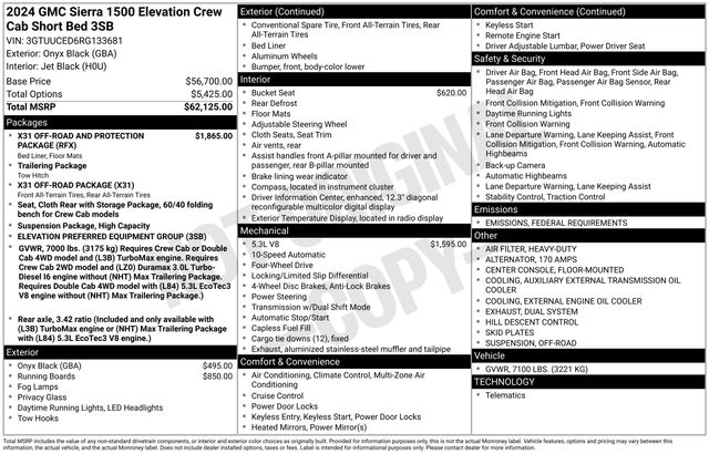 All-Weather Floor Liner (LPO), Navigation System, Spray-On Pickup Bedliner w/GMC Logo, X31 Off-Road & Protection Package, X31 Off-Road Package, 10-Way Power Driver Seat Adjuster w/Lumbar, 120-Volt Bed Mounted Power Outlet, 120-Volt Interior Power Outlet, 170 Amp Alternator, 2 Charge/Data USB Ports, 2 Charge/Data USB Ports Inside Center Console, 2 Type-C Charge-Only Rear USB Ports, 220 Amp Alternator, 4-Way Manual Passenger Seat Adjuster, 4-Wheel Disc Brakes, 6 Speakers, 6-Speaker Audio System Feature, 6" Rectangular Black Tubular Assist Steps (LPO), ABS brakes, Air Conditioning, Alloy wheels, AM/FM radio: SiriusXM with 360L, Apple CarPlay/Android Auto, Auto High-beam Headlights, Auto-Locking Rear Differential, Automatic Emergency Braking, Automatic temperature control, Auxiliary External Transmission Oil Cooler, Body Color Header w/Gloss Black Mesh Grille Bars, Brake assist, Buckle to Drive, Bumpers: body-color, Cloth Rear Seat w/Storage Package, Cloth Seat Trim, Color-Keyed Carpeting Floor Covering, Compass, Deep-Tinted Glass, Delay-off headlights, Driver door bin, Driver vanity mirror, Dual Exhaust System, Dual front impact airbags, Dual front side impact airbags, Electric Rear-Window Defogger, Electronic Precision Shift, Electronic Stability Control, External Engine Oil Cooling, Floor-Mounted Center Console, Following Distance Indicator, Forward Collision Alert, Front 40/20/40 Split-Bench Seat, Front anti-roll bar, Front Bucket Seats, Front Center Armrest w/Storage, Front dual zone A/C, Front fog lights, Front Frame-Mounted Black Recovery Hooks, Front Pedestrian Braking, Front reading lights, Front Rubberized-Vinyl Floor Mats, Front wheel independent suspension, Fully automatic headlights, Genuine wood dashboard insert, GMC Connected Access Capable, HD Rear Vision Camera, Heated door mirrors, Heated Driver & Front Outboard Passenger Seating, Heated front seats, Heated steering wheel, Heavy-Duty Air Filter, High Capacity Suspension Package, Hill Descent Control, Hitch Guidance, Illuminated entry, IntelliBeam Automatic High Beam On/Off, Keyless Open & Start, Lane Keep Assist w/Lane Departure Warning, LED Cargo Area Lighting, Low tire pressure warning, Manual Tilt-Wheel & Telescoping Steering Column, Occupant sensing airbag, Off-Road Suspension, OnStar & GMC Connected Services Capable, Outside temperature display, Overhead airbag, Overhead console, Panic alarm, Passenger door bin, Passenger vanity mirror, Power Door Locks, Power door mirrors, Power driver seat, Power Front Windows w/Driver Express Up/Down, Power Front Windows w/Passenger Express Down, Power Rear Windows w/Express Down, Power steering, Power windows, Preferred Equipment Group 3SB, Premium audio system: GMC Infotainment System, Push Button Start, Radio data system, Radio: Premium GMC Infotainment Audio System, Rear reading lights, Rear Rubberized-Vinyl Floor Mats, Rear seat center armrest, Rear step bumper, Rear Wheelhouse Liners, Rear window defroster, Remote keyless entry, Remote Vehicle Starter System, Security system, SiriusXM w/360L, Speed control, Speed-sensing steering, Split folding rear seat, Standard Tailgate, Steering Wheel Audio Controls, Steering wheel mounted audio controls, Tachometer, Telescoping steering wheel, Theft Deterren
