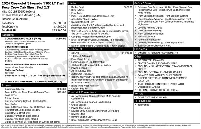 10-Way Power Driver Seat w/Lumbar, 12.3" Multicolor Reconfigurable Digital Display, 120-Volt Interior Power Outlet, 6-Speaker Audio System, All-Weather Floor Liner (LPO) (AAK), Auto-Locking Rear Differential, Bluetooth® For Phone, Color-Keyed Carpeting Floor Covering, Convenience Package, Convenience Package II, Deep-Tinted Glass, Dual Rear USB Ports (Charge Only), Dual-Zone Automatic Climate Control, Electric Rear-Window Defogger, Electrical Steering Column Lock, Electronic Cruise Control, EZ Lift Power Lock & Release Tailgate, Front LED Fog Lamps, HD Rear Vision Camera, Heated Driver & Front Outboard Passenger Seats, Heated Power-Adjustable Outside Mirrors, Heated Steering Wheel, High Gloss Black Mirror Caps, Hitch Guidance w/Hitch View, In-Vehicle Trailering System App, Inside Rear-View Mirror w/Tilt, Integrated Trailer Brake Controller, Keyless Open & Start, LED Cargo Area Lighting, OnStar & Chevrolet Connected Services Capable, Performance Red Recovery Hooks, Power Front Windows w/Driver Express Up/Down, Power Front Windows w/Passenger Express Down, Power Rear Windows w/Express Down, Power Sliding Rear Window w/Rear Defogger, Preferred Equipment Group 2LT, Premium Bose 7-Speaker Sound System, Rear 60/40 Folding Bench Seat (Folds Up), Remote Vehicle Starter System, SiriusXM w/360L, Standard Tailgate, Steering Wheel Audio Controls, Theft Deterrent System (Unauthorized Entry), Trailering Package, Universal Home Remote, Wheels: 20" x 9" High Gloss Black Painted Alum, Wrapped Steering Wheel, 120-Volt Bed Mounted Power Outlet, 170 Amp Alternator, 2 USB Data Ports, 220 Amp Alternator, 3.23 Rear Axle Ratio, 3.42 Rear Axle Ratio, 4-Wheel Disc Brakes, 40/20/40 Front Split-Bench Seat, 6 Speakers, ABS brakes, Air Conditioning, Alloy wheels, AM/FM radio: SiriusXM with 360L, Auto High-beam Headlights, Automatic Emergency Braking, Automatic temperature control, Auxiliary External Transmission Oil Cooler, Brake assist, Chevrolet Connected Access Capable, Cloth Seat Trim, Compass, Delay-off headlights, Driver door bin, Driver vanity mirror, Dual Exhaust w/Polished Outlets, Dual front impact airbags, Dual front side impact airbags, Electronic Stability Control, Electronic Transmission Range Selector Shifter, External Engine Oil Cooler, Floor Mounted Center Console, Following Distance Indicator, Forward Collision Alert, Front anti-roll bar, Front Bucket Seats, Front Center Armrest w/Storage, Front dual zone A/C, Front fog lights, Front Pedestrian Braking, Front reading lights, Front wheel independent suspension, Fully automatic headlights, Heated door mirrors, Heated front seats, Heated steering wheel, Heavy-Duty Air Filter, Hill Descent Control, Hitch Guidance, Illuminated entry, IntelliBeam Automatic High Beam On/Off, Lane Keep Assist w/Lane Departure Warning, Low tire pressure warning, Occupant sensing airbag, Outside temperature display, Overhead airbag, Overhead console, Panic alarm, Passenger door bin, Passenger vanity mirror, Power door mirrors, Power driver seat, Power steering, Power windows, Premium audio system: Chevrolet Infotainment 3 Premium, Radio data system, Radio: Chevrolet Infotainment 3 Premium System, Rear reading lights, Rear step bumper, Rear window defrost