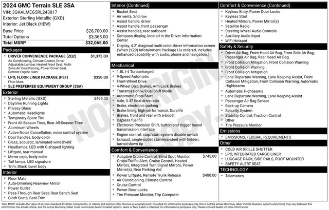 8-Way Power Driver Seat Adjuster, Adaptive Cruise Control, Driver & Front Passenger Heated Seats, Driver Convenience Package, Dual-Zone Automatic Climate Control, GMC Pro Safety Plus, Lane Change Alert w/Side Blind Zone Alert, Outside Heated Power-Adjustable Mirrors, Rear Cross-Traffic Alert, Rear Park Assist, Remote Start, Roof-Mounted Luggage Rack Side Rails, Safety Alert Seat, 2 USB Data Ports w/Auxiliary Input Jack, 3.47 Final Drive Axle Ratio, 4-Way Manual Driver's Seat, 4-Way Manual Front Passenger Seat, 4-Wheel Disc Brakes, 4.2" Multi-Color Driver Information Screen, 6 Speakers, 6-Speaker Audio System Feature, ABS brakes, Air Conditioning, Alloy wheels, AM/FM radio: SiriusXM, Auto High-beam Headlights, Auto-dimming Rear-View mirror, Automatic temperature control, Bluetooth® For Phone, Brake assist, Bumpers: body-color, Cold Air Grille Shutter, Compass, Delay-off headlights, Driver door bin, Driver vanity mirror, Dual front impact airbags, Dual front side impact airbags, Electronic Stability Control, Emergency communication system: OnStar and GMC connected services capable, Floor Liner Package (LPO), Four wheel independent suspension, Front & Rear All-Weather Floor Liners (LPO), Front anti-roll bar, Front Bucket Seats, Front Center Armrest, Front reading lights, Fully automatic headlights, Heated door mirrors, Illuminated entry, Integrated Cargo Liner (LPO), Low tire pressure warning, Occupant sensing airbag, Outside temperature display, Overhead airbag, Overhead console, Panic alarm, Passenger door bin, Passenger vanity mirror, Power door mirrors, Power Driver Lumbar Control, Power Programmable Rear Liftgate, Power steering, Power windows, Preferred Equipment Group 3SA, Premium Cloth Seat Trim, Radio data system, Radio: GMC Infotainment Audio System w/7" Display, Rear anti-roll bar, Rear seat center armrest, Rear window defroster, Rear window wiper, Remote keyless entry, Security system, SiriusXM, Speed control, Speed-sensing steering, Split folding rear seat, Spoiler, Steering wheel mounted audio controls, Tachometer, Telescoping steering wheel, Tilt steering wheel, Traction control, Trip computer, Variably intermittent wipers, Wheels: 17" x 7" Silver Painted Aluminum, Wireless Apple CarPlay/Wireless Android Auto, 8-Way Power Driver Seat Adjuster, Adaptive Cruise Control, Driver & Front Passenger Heated Seats, Driver Convenience Package, Dual-Zone Automatic Climate Control, GMC Pro Safety Plus, Lane Change Alert w/Side Blind Zone Alert, Outside Heated Power-Adjustable Mirrors, Rear Cross-Traffic Alert, Rear Park Assist, Remote Start, Roof-Mounted Luggage Rack Side Rails, Safety Alert Seat.