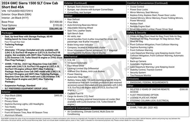 Hitch Guidance, Navigation System, Trailering Package, 10-Way Power Driver Seat Adjuster w/Lumbar, 10-Way Power Passenger Seat Adjuster w/Lumbar, 120-Volt Bed Mounted Power Outlet, 120-Volt Interior Power Outlet, 170 Amp Alternator, 2 Charge/Data USB Ports, 2 Type-C Charge-Only Rear USB Ports, 3.23 Rear Axle Ratio, 4-Wheel Disc Brakes, 6 Speakers, 6-Speaker Audio System Feature, ABS brakes, Air Conditioning, Alloy wheels, AM/FM radio: SiriusXM with 360L, Apple CarPlay/Android Auto, Auto High-beam Headlights, Auto-dimming door mirrors, Auto-dimming Rear-View mirror, Auto-Locking Rear Differential, Automatic Emergency Braking, Automatic temperature control, Auxiliary External Transmission Oil Cooler, Brake assist, Buckle to Drive, Bumpers: chrome, Chrome Header & Chrome Grille Insert Bars, Color-Keyed Carpeting Floor Covering, Compass, Deep-Tinted Glass, Delay-off headlights, Deleted 3 Years of OnStar Remote Access, Driver door bin, Driver Memory, Driver vanity mirror, Dual front impact airbags, Dual front side impact airbags, Electric Rear-Window Defogger, Electronic Stability Control, Following Distance Indicator, Forward Collision Alert, Front 40/20/40 Split-Bench Seat, Front anti-roll bar, Front Center Armrest w/Storage, Front dual zone A/C, Front fog lights, Front Frame-Mounted Black Recovery Hooks, Front License Plate Kit, Front Pedestrian Braking, Front Rain-Sensing Wipers, Front reading lights, Front wheel independent suspension, Fully automatic headlights, GMC Connected Access Capable, HD Rear Vision Camera, Heated door mirrors, Heated Driver & Front Outboard Passenger Seating, Heated front seats, Heated steering wheel, Illuminated entry, IntelliBeam Automatic High Beam On/Off, Keyless Open & Start, Lane Keep Assist w/Lane Departure Warning, LED Cargo Area Lighting, Low tire pressure warning, Manual Tilt-Wheel & Telescoping Steering Column, Memory seat, Occupant sensing airbag, OnStar & GMC Connected Services Capable, Outside temperature display, Overhead airbag, Overhead console, Panic alarm, Passenger door bin, Passenger vanity mirror, Perf Leather-Appointed Front Outboard Seat Trim, Perimeter Lighting, Power Door Locks, Power door mirrors, Power driver seat, Power Front Passenger Windows w/Express Up/Down, Power Front Windows w/Driver Express Up/Down, Power passenger seat, Power Rear Windows w/Express Down, Power steering, Power windows, Preferred Equipment Group 4SA, Premium audio system: GMC Infotainment System, Push Button Start, Radio data system, Radio: Premium GMC Infotainment Audio System, Rain sensing wipers, Rear reading lights, Rear seat center armrest, Rear step bumper, Rear Wheelhouse Liners, Rear window defroster, Remote keyless entry, Remote Vehicle Starter System, Security system, SiriusXM w/360L, Speed control, Speed-sensing steering, Split folding rear seat, Standard Suspension Package, Steering Wheel Audio Controls, Steering wheel mounted audio controls, Tachometer, Telescoping steering wheel, Theft Deterrent System (Unauthorized Entry), Tilt steering wheel, Traction control, Trip computer, Variably intermittent wipers, Voltmeter, Wheels: 18" x 8.5" 6-Spoke Machined Aluminum, Wi-Fi Hotspot Capable, Wireless Apple CarPlay/Wireless Android Auto, Hitch Guidance, Navigation System, T