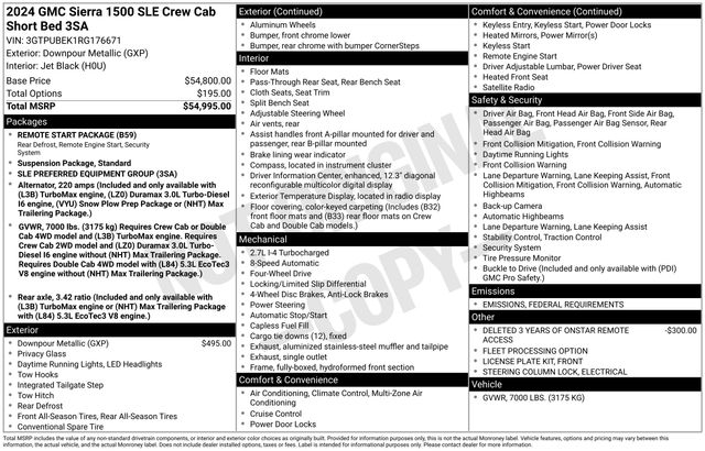 Auto-Locking Rear Differential, Dual-Zone Automatic Climate Control, LED Cargo Area Lighting, Navigation System, Remote Start Package, SLE Convenience Package, SLE Value Package, Trailering Package, 10-Way Power Driver Seat Adjuster w/Lumbar, 120-Volt Bed Mounted Power Outlet, 120-Volt Interior Power Outlet, 2 Charge/Data USB Ports, 2 Type-C Charge-Only Rear USB Ports, 220 Amp Alternator, 4-Way Manual Passenger Seat Adjuster, 4-Wheel Disc Brakes, 6 Speakers, 6-Speaker Audio System Feature, ABS brakes, Air Conditioning, Alloy wheels, AM/FM radio: SiriusXM with 360L, Apple CarPlay/Android Auto, Auto High-beam Headlights, Automatic Emergency Braking, Automatic temperature control, Brake assist, Buckle to Drive, Bumpers: chrome, Chrome Header w/Medium Silver Grille Insert Bars, Cloth Seat Trim, Color-Keyed Carpeting Floor Covering, Compass, Deep-Tinted Glass, Delay-off headlights, Deleted 3 Years of OnStar Remote Access, Driver door bin, Driver vanity mirror, Dual front impact airbags, Dual front side impact airbags, Electric Rear-Window Defogger, Electronic Stability Control, Following Distance Indicator, Forward Collision Alert, Front 40/20/40 Split-Bench Seat, Front anti-roll bar, Front Center Armrest w/Storage, Front dual zone A/C, Front Frame-Mounted Black Recovery Hooks, Front License Plate Kit, Front Pedestrian Braking, Front reading lights, Front Rubberized-Vinyl Floor Mats, Front wheel independent suspension, Fully automatic headlights, GMC Connected Access Capable, HD Rear Vision Camera, Heated door mirrors, Heated Driver & Front Outboard Passenger Seating, Heated front seats, Heated steering wheel, Hitch Guidance, Illuminated entry, IntelliBeam Automatic High Beam On/Off, Keyless Open & Start, Lane Keep Assist w/Lane Departure Warning, Low tire pressure warning, Manual Tilt-Wheel & Telescoping Steering Column, Occupant sensing airbag, OnStar & GMC Connected Services Capable, Outside temperature display, Overhead airbag, Overhead console, Panic alarm, Passenger door bin, Passenger vanity mirror, Power Door Locks, Power door mirrors, Power driver seat, Power Front Windows w/Driver Express Up/Down, Power Front Windows w/Passenger Express Down, Power Rear Windows w/Express Down, Power steering, Power windows, Preferred Equipment Group 3SA, Premium audio system: GMC Infotainment System, Push Button Start, Radio data system, Radio: Premium GMC Infotainment Audio System, Rear reading lights, Rear Rubberized-Vinyl Floor Mats, Rear step bumper, Rear window defroster, Remote keyless entry, Remote Vehicle Starter System, Security system, SiriusXM w/360L, Speed control, Speed-sensing steering, Split folding rear seat, Standard Suspension Package, Steering Wheel Audio Controls, Steering wheel mounted audio controls, Tachometer, Telescoping steering wheel, Theft Deterrent System (Unauthorized Entry), Tilt steering wheel, Traction control, Trip computer, Variably intermittent wipers, Voltmeter, Wheels: 17" x 8" Bright Silver Painted Aluminum, Wi-Fi Hotspot Capable, Wireless Apple CarPlay/Wireless Android Auto, Auto-Locking Rear Differential, Dual-Zone Automatic Climate Control, LED Cargo Area Lighting, Navigation System, Remote Start Package, SLE Convenience Package, SLE Value Package, Trailering Package.