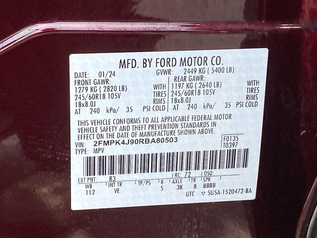 Equipment Group 201A, Rear Parking Sensors, Speed control, Wheels: 18" Sparkle Silver-Painted Aluminum, 3.80 Axle Ratio, 4-Wheel Disc Brakes, 6 Speakers, ABS brakes, ActiveX Trimmed Heated Bucket Seats, Air Conditioning, Alloy wheels, AM/FM radio: SiriusXM with 360L, AM/FM Stereo, Auto High-beam Headlights, Auto-dimming Rear-View mirror, Automatic temperature control, Brake assist, Bumpers: body-color, Compass, Delay-off headlights, Driver door bin, Driver vanity mirror, Dual front impact airbags, Dual front side impact airbags, Electronic Stability Control, Emergency communication system: SYNC 4 911 Assist, FordPass Connect, Four wheel independent suspension, Front anti-roll bar, Front Bucket Seats, Front Center Armrest w/Storage, Front dual zone A/C, Front reading lights, Fully automatic headlights, Heated door mirrors, Heated front seats, Illuminated entry, Knee airbag, Leather steering wheel, Low tire pressure warning, Occupant sensing airbag, Outside temperature display, Overhead airbag, Overhead console, Panic alarm, Passenger door bin, Passenger vanity mirror, Power door mirrors, Power driver seat, Power Liftgate, Power passenger seat, Power steering, Power windows, Rear anti-roll bar, Rear reading lights, Rear seat center armrest, Rear window defroster, Rear window wiper, Remote keyless entry, SiriusXM w/360L, Speed-Sensitive Wipers, Split folding rear seat, Spoiler, Steering wheel mounted audio controls, SYNC 4A w/Enhanced Voice Recognition, Tachometer, Telescoping steering wheel, Tilt steering wheel, Traction control, Trip computer, Variably intermittent wipers, One Owner Clean Carfax, ALL WHEEL DRIVE, Equipment Group 201A, Rear Parking Sensors, Speed control, Wheels: 18" Sparkle Silver-Painted Aluminum.