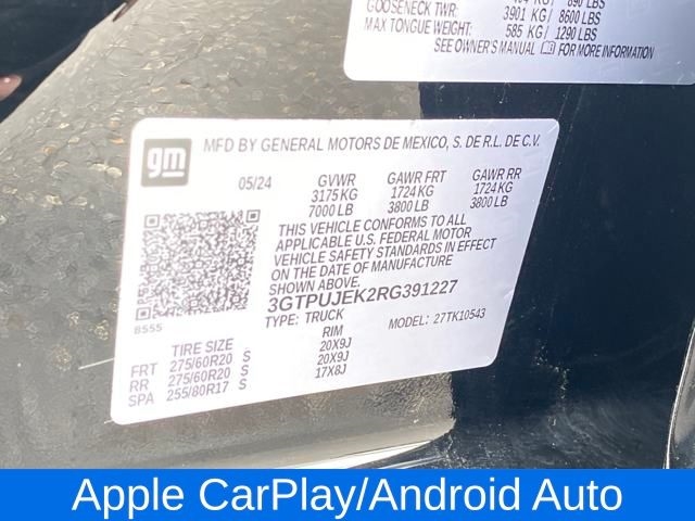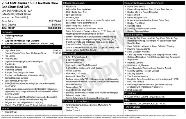120-Volt Interior Power Outlet, 2 Charge/Data USB Ports, 2 Type-C Charge-Only Rear USB Ports, 220 Amp Alternator, Apple CarPlay/Android Auto, Auto-Locking Rear Differential, Body Color Header w/Gloss Black Mesh Grille Bars, Color-Keyed Carpeting Floor Covering, Deep-Tinted Glass, Electric Rear-Window Defogger, Front Frame-Mounted Black Recovery Hooks, GMC Connected Access Capable, HD Rear Vision Camera, Keyless Open & Start, LED Cargo Area Lighting, Manual Tilt-Wheel & Telescoping Steering Column, Navigation System, OnStar & GMC Connected Services Capable, Power Door Locks, Power Front Windows w/Driver Express Up/Down, Power Front Windows w/Passenger Express Down, Power Rear Windows w/Express Down, Preferred Equipment Group 3VL, Push Button Start, Remote Vehicle Starter System, SiriusXM w/360L, Speed control, Steering Wheel Audio Controls, Theft Deterrent System (Unauthorized Entry), Trailering Package, Wi-Fi Hotspot Capable, 10-Way Power Driver Seat Adjuster w/Lumbar, 120-Volt Bed Mounted Power Outlet, 3.42 Rear Axle Ratio, 4-Way Manual Passenger Seat Adjuster, 4-Wheel Disc Brakes, 6 Speakers, 6-Speaker Audio System Feature, ABS brakes, Air Conditioning, Alloy wheels, AM/FM radio: SiriusXM with 360L, Auto High-beam Headlights, Automatic Emergency Braking, Automatic temperature control, Brake assist, Buckle to Drive, Bumpers: body-color, Cloth Seat Trim, Compass, Delay-off headlights, Driver door bin, Driver vanity mirror, Dual front impact airbags, Dual front side impact airbags, Electronic Stability Control, Following Distance Indicator, Forward Collision Alert, Front 40/20/40 Split-Bench Seat, Front anti-roll bar, Front Center Armrest w/Storage, Front dual zone A/C, Front fog lights, Front Pedestrian Braking, Front reading lights, Front Rubberized-Vinyl Floor Mats, Front wheel independent suspension, Fully automatic headlights, Genuine wood dashboard insert, Heated door mirrors, Heated Driver & Front Outboard Passenger Seating, Heated front seats, Heated steering wheel, High Capacity Suspension Package, Hitch Guidance, Illuminated entry, IntelliBeam Automatic High Beam On/Off, Lane Keep Assist w/Lane Departure Warning, Low tire pressure warning, Occupant sensing airbag, Outside temperature display, Overhead airbag, Overhead console, Panic alarm, Passenger door bin, Passenger vanity mirror, Power door mirrors, Power driver seat, Power steering, Power windows, Premium audio system: GMC Infotainment System, Radio data system, Radio: Premium GMC Infotainment Audio System, Rear reading lights, Rear Rubberized-Vinyl Floor Mats, Rear seat center armrest, Rear step bumper, Rear window defroster, Remote keyless entry, Security system, Speed-sensing steering, Split folding rear seat, Steering wheel mounted audio controls, Tachometer, Telescoping steering wheel, Tilt steering wheel, Traction control, Trip computer, Variably intermittent wipers, Voltmeter, Wheels: 20" x 9" High Gloss Black Painted Aluminum, Wireless Apple CarPlay/Wireless Android Auto, Clean Carfax, TUROMAX ENGINE, 120-Volt Interior Power Outlet, 2 Charge/Data USB Ports, 2 Type-C Charge-Only Rear USB Ports, 220 Amp Alternator, Apple CarPlay/Android Auto, Auto-Locking Rear Differential, Body Color Header w/Glo
