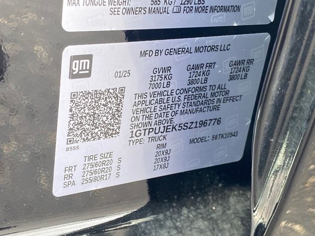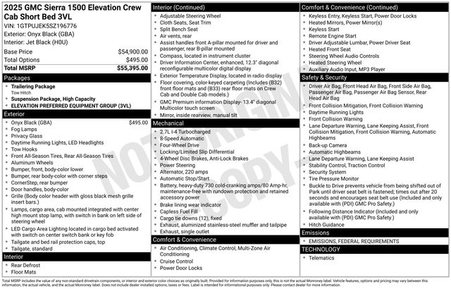 Navigation System, 10-Way Power Driver Seat Adjuster w/Lumbar, 120-Volt Bed Mounted Power Outlet, 120-Volt Interior Power Outlet, 2 Charge/Data USB Ports, 2 Type-C Charge-Only Rear USB Ports, 220 Amp Alternator, 3.42 Rear Axle Ratio, 4-Way Manual Passenger Seat Adjuster, 4-Wheel Disc Brakes, 6 Speakers, 6-Speaker Audio System Feature, ABS brakes, Air Conditioning, Alloy wheels, AM/FM radio: SiriusXM with 360L, Apple CarPlay/Android Auto, Auto High-beam Headlights, Auto-Locking Rear Differential, Automatic Emergency Braking, Automatic temperature control, Body Color Header w/Gloss Black Mesh Grille Bars, Brake assist, Buckle to Drive, Bumpers: body-color, Cloth Seat Trim, Color-Keyed Carpeting Floor Covering, Compass, Deep-Tinted Glass, Delay-off headlights, Driver door bin, Driver vanity mirror, Dual front impact airbags, Dual front side impact airbags, Electric Rear-Window Defogger, Electronic Stability Control, Emergency communication system: OnStar, Following Distance Indicator, Forward Collision Alert, Front 40/20/40 Split-Bench Seat, Front anti-roll bar, Front Center Armrest w/Storage, Front dual zone A/C, Front fog lights, Front Frame-Mounted Black Recovery Hooks, Front Pedestrian Braking, Front reading lights, Front Rubberized-Vinyl Floor Mats, Front wheel independent suspension, Fully automatic headlights, Genuine wood dashboard insert, HD Rear Vision Camera, Heated door mirrors, Heated Driver & Front Outboard Passenger Seating, Heated front seats, Heated steering wheel, High Capacity Suspension Package, Hitch Guidance, Illuminated entry, IntelliBeam Automatic High Beam On/Off, Keyless Open & Start, Lane Keep Assist w/Lane Departure Warning, LED Cargo Area Lighting, Low tire pressure warning, Manual Tilt-Wheel & Telescoping Steering Column, Occupant sensing airbag, OnStar Services Capable, Outside temperature display, Overhead airbag, Overhead console, Panic alarm, Passenger door bin, Passenger vanity mirror, Power Door Locks, Power door mirrors, Power driver seat, Power Front Windows w/Driver Express Up/Down, Power Front Windows w/Passenger Express Down, Power Rear Windows w/Express Down, Power steering, Power windows, Preferred Equipment Group 3VL, Push Button Start, Radio data system, Radio: Premium GMC Infotainment Audio System, Rear reading lights, Rear Rubberized-Vinyl Floor Mats, Rear seat center armrest, Rear step bumper, Rear window defroster, Remote keyless entry, Remote Vehicle Starter System, Security system, SiriusXM w/360L Trial Subscription, Speed control, Speed-sensing steering, Split folding rear seat, Steering Wheel Audio Controls, Steering wheel mounted audio controls, Tachometer, Telescoping steering wheel, Theft Deterrent System (Unauthorized Entry), Tilt steering wheel, Traction control, Trailering Package, Trip computer, Variably intermittent wipers, Voltmeter, Wheels: 20" x 9" High Gloss Black Painted Aluminum, Wi-Fi Hotspot Capable, Wireless Apple CarPlay/Wireless Android Auto, Navigation System.