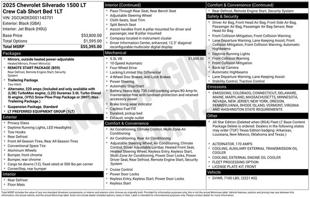 10-Way Power Driver Seat w/Lumbar, 120-Volt Interior Power Outlet, Convenience Package, Dual Rear USB Ports (Charge Only), Dual-Zone Automatic Climate Control, Electric Rear-Window Defogger, Heated Driver & Front Outboard Passenger Seats, Heated Steering Wheel, Hitch Guidance, Keyless Open & Start, LED Cargo Area Lighting, Manual Tilt/Telescoping Steering Column, Remote Start Package, Remote Vehicle Starter System, Theft Deterrent System (Unauthorized Entry), Trailering Package, Wrapped Steering Wheel, 12.3" Multicolor Reconfigurable Digital Display, 120-Volt Bed Mounted Power Outlet, 170 Amp Alternator, 220 Amp Alternator, 3.23 Rear Axle Ratio, 4-Wheel Disc Brakes, 40/20/40 Front Split-Bench Seat, 6 Speakers, 6-Speaker Audio System, ABS brakes, Air Conditioning, All-Star Edition, Alloy wheels, AM/FM radio: SiriusXM with 360L, Apple CarPlay/Android Auto, Auto High-beam Headlights, Auto-Locking Rear Differential, Automatic Emergency Braking, Automatic temperature control, Auxiliary External Transmission Oil Cooler, Bluetooth® For Phone, Brake assist, Bumpers: chrome, Chrome Mirror Caps, Cloth Seat Trim, Color-Keyed Carpeting Floor Covering, Compass, Deep-Tinted Glass, Delay-off headlights, Driver door bin, Driver vanity mirror, Dual front impact airbags, Dual front side impact airbags, Electronic Cruise Control, Electronic Stability Control, Emergency communication system: OnStar, External Engine Oil Cooler, EZ Lift Power Lock & Release Tailgate, Following Distance Indicator, Forward Collision Alert, Front anti-roll bar, Front Center Armrest w/Storage, Front dual zone A/C, Front Frame-Mounted Black Recovery Hooks, Front License Plate Kit, Front Pedestrian Braking, Front reading lights, Front Rubberized Vinyl Floor Mats, Front wheel independent suspension, Fully automatic headlights, HD Rear Vision Camera, Heated door mirrors, Heated front seats, Heated Power-Adjustable Outside Mirrors, Heated steering wheel, Illuminated entry, Inside Rear-View Mirror w/Tilt, Integrated Trailer Brake Controller, IntelliBeam Automatic High Beam On/Off, Lane Keep Assist w/Lane Departure Warning, Low tire pressure warning, Occupant sensing airbag, OnStar Services Capable, Outside temperature display, Overhead airbag, Overhead console, Panic alarm, Passenger door bin, Passenger vanity mirror, Power door mirrors, Power driver seat, Power Front Windows w/Driver Express Up/Down, Power Front Windows w/Passenger Express Down, Power Rear Windows w/Express Down, Power steering, Power windows, Preferred Equipment Group 1LT, Premium audio system: Chevrolet Infotainment 3 Premium, Radio data system, Radio: Chevrolet Infotainment 3 Premium System, Rear 60/40 Folding Bench Seat (Folds Up), Rear reading lights, Rear Rubberized-Vinyl Floor Mats, Rear step bumper, Rear window defroster, Remote keyless entry, Security system, SiriusXM w/360L Trial Subscription, Speed control, Speed-sensing steering, Split folding rear seat, Standard Suspension Package, Standard Tailgate, Steering Wheel Audio Controls, Steering wheel mounted audio controls, Tachometer, Teen Driver, Telescoping steering wheel, Tilt steering wheel, Tire Pressure Monitoring System, Traction control, Trip computer, Variably intermittent wipers, Voltmeter, Wheels: 17" x 8" Bright Sil