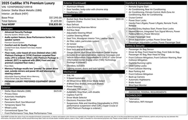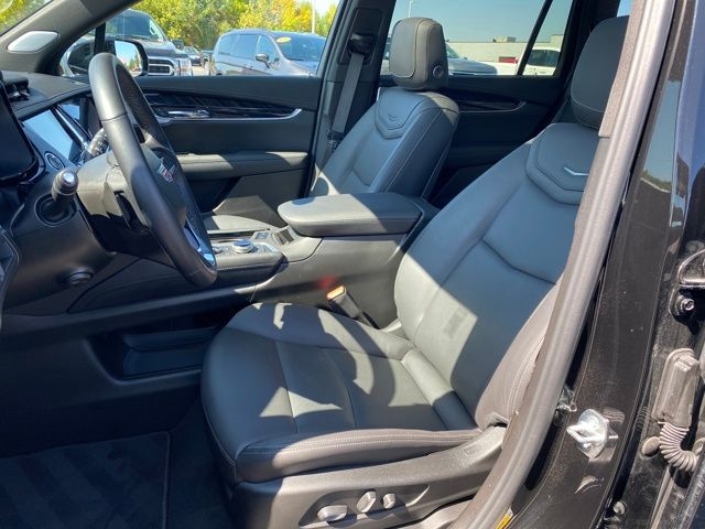 Navigation System, 14 Speakers, 2-Way Power Driver Lumbar Control Seat Adjuster, 2-Way Power Passenger Lumbar Control Seat Adjuster, 3rd row seats: split-bench, 4-Wheel Disc Brakes, 6-Passenger Seating, 8-Way Power Driver Seat Adjuster, ABS brakes, Air Conditioning, Alloy wheels, AM/FM radio: SiriusXM with 360L, Audio memory, Auto High-beam Headlights, Auto tilt-away steering wheel, Auto-dimming door mirrors, Auto-dimming Rear-View mirror, Automatic Emergency Braking, Automatic Stop/Start w/Disable, Automatic temperature control, Bose Performance Series Audio System, Brake assist, Bumpers: body-color, Compass, Delay-off headlights, Driver & Front Passenger Heated Seats, Driver door bin, Driver vanity mirror, Dual Driver Info Center Display Gauge Cluster, Dual front impact airbags, Dual front side impact airbags, Electronic Stability Control, Emergency communication system: OnStar and Cadillac connected services capable, Four wheel independent suspension, Front & Rear Park Assist, Front anti-roll bar, Front Bucket Seats, Front Center Armrest, Front dual zone A/C, Front reading lights, Fully automatic headlights, Garage door transmitter, Genuine wood dashboard insert, Genuine wood door panel insert, Heated door mirrors, Heated front seats, Heated rear seats, Heated steering wheel, Illuminated entry, Inside Rear-View Auto-Dimming Mirror, Knee airbag, Leather Seating Surfaces w/Mini-Perforated Inserts, Leather steering wheel, Low tire pressure warning, Memory seat, Occupant sensing airbag, Outside temperature display, Overhead airbag, Overhead console, Panic alarm, Passenger door bin, Passenger vanity mirror, Power door mirrors, Power driver seat, Power Liftgate, Power moonroof: UltraView, Power passenger seat, Power steering, Power windows, Preferred Equipment Group 1SD, Radio data system, Radio: Cadillac User Experience w/Embedded Nav, Rain sensing wipers, Rear air conditioning, Rear anti-roll bar, Rear reading lights, Rear seat center armrest, Rear window defroster, Rear window wiper, Remote keyless entry, Ride & Handling Suspension, Security system, SiriusXM w/360L, Speed control, Speed-sensing steering, Split folding rear seat, Spoiler, Steering wheel memory, Steering wheel mounted audio controls, Tachometer, Teen Driver, Telescoping steering wheel, Tilt steering wheel, Traction control, Trip computer, Turn signal indicator mirrors, Variably intermittent wipers, Ventilated Driver & Front Passenger Seats, Ventilated front seats, Voltmeter, Wheels: 20" 6-Split Spoke Alloy, Wireless Apple CarPlay/Wireless Android Auto, One Owner Clean Carfax, ALL WHEEL DRIVE, Navigation System.
