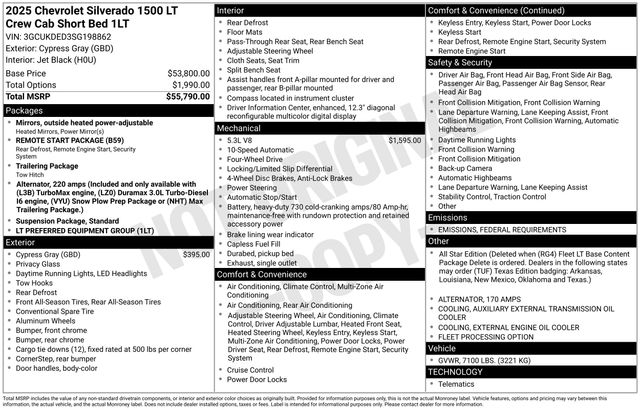 10-Way Power Driver Seat w/Lumbar, 12.3" Multicolor Reconfigurable Digital Display, 120-Volt Interior Power Outlet, 3.23 Rear Axle Ratio, All-Star Edition, Apple CarPlay/Android Auto, Auto-Locking Rear Differential, Bluetooth® For Phone, Chrome Mirror Caps, Color-Keyed Carpeting Floor Covering, Convenience Package, Deep-Tinted Glass, Dual Rear USB Ports (Charge Only), Dual-Zone Automatic Climate Control, Electronic Cruise Control, EZ Lift Power Lock & Release Tailgate, Front Frame-Mounted Black Recovery Hooks, Front Rubberized Vinyl Floor Mats, HD Rear Vision Camera, Heated Driver & Front Outboard Passenger Seats, Heated Power-Adjustable Outside Mirrors, Heated Steering Wheel, Inside Rear-View Mirror w/Tilt, Integrated Trailer Brake Controller, Keyless Open & Start, LED Cargo Area Lighting, Manual Tilt/Telescoping Steering Column, OnStar Services Capable, Power Front Windows w/Driver Express Up/Down, Power Front Windows w/Passenger Express Down, Power Rear Windows w/Express Down, Preferred Equipment Group 1LT, Rear 60/40 Folding Bench Seat (Folds Up), Rear Rubberized-Vinyl Floor Mats, Remote Start Package, SiriusXM w/360L Trial Subscription, Standard Tailgate, Steering Wheel Audio Controls, Teen Driver, Tire Pressure Monitoring System, Trailering Package, Wheels: 17" x 8" Bright Silver Painted Aluminum, Wrapped Steering Wheel, 120-Volt Bed Mounted Power Outlet, 170 Amp Alternator, 220 Amp Alternator, 4-Wheel Disc Brakes, 40/20/40 Front Split-Bench Seat, 6 Speakers, 6-Speaker Audio System, ABS brakes, Air Conditioning, Alloy wheels, AM/FM radio: SiriusXM with 360L, Auto High-beam Headlights, Automatic Emergency Braking, Automatic temperature control, Auxiliary External Transmission Oil Cooler, Brake assist, Bumpers: chrome, Cloth Seat Trim, Compass, Delay-off headlights, Driver door bin, Driver vanity mirror, Dual front impact airbags, Dual front side impact airbags, Electric Rear-Window Defogger, Electronic Stability Control, Emergency communication system: OnStar, External Engine Oil Cooler, Following Distance Indicator, Forward Collision Alert, Front anti-roll bar, Front Center Armrest w/Storage, Front dual zone A/C, Front Pedestrian Braking, Front reading lights, Front wheel independent suspension, Fully automatic headlights, Heated door mirrors, Heated front seats, Heated steering wheel, Hitch Guidance, Illuminated entry, IntelliBeam Automatic High Beam On/Off, Lane Keep Assist w/Lane Departure Warning, Low tire pressure warning, Occupant sensing airbag, Outside temperature display, Overhead airbag, Overhead console, Panic alarm, Passenger door bin, Passenger vanity mirror, Power door mirrors, Power driver seat, Power steering, Power windows, Premium audio system: Chevrolet Infotainment 3 Premium, Radio data system, Radio: Chevrolet Infotainment 3 Premium System, Rear reading lights, Rear step bumper, Rear window defroster, Remote keyless entry, Remote Vehicle Starter System, Security system, Speed control, Speed-sensing steering, Split folding rear seat, Standard Suspension Package, Steering wheel mounted audio controls, Tachometer, Telescoping steering wheel, Theft Deterrent System (Unauthorized Entry), Tilt steering wheel, Traction control, Trip computer, Variably intermittent wipers, Voltmeter, Wi-