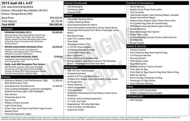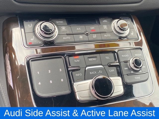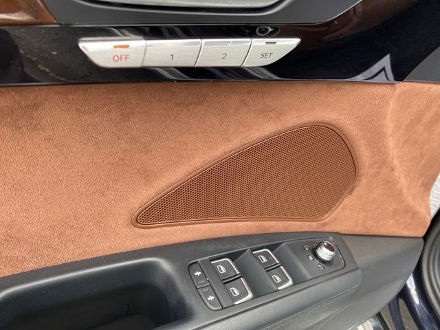 22-Way Multi-Contour Comfort Seat, Audi Adaptive Cruise Control w/Stop & Go, Audi Head-Up Display, Audi Side Assist & Active Lane Assist, Audi Side Assist w/Pre Sense Rear, Cold Weather Package, Driver Assistance Package, Heated 4-Spoke Steering Wheel w/Shift Paddles, Heated Rear Seats, High-Beam Assistant, Navigation System, Premium Package, Rear Seat Pass-Through, Topview Camera System (Front, Rear & Side Views), 14 Speakers, 18-Way Power Heated Front Seats w/Memory, 4-Wheel Disc Brakes, 9.0J x 19" 15-Spoke Design Wheels, 9.0J x 20" 10-Parallel-Spoke Design Wheels, ABS brakes, Adaptive suspension, Air Conditioning, Alloy wheels, AM/FM radio: SiriusXM, Auto tilt-away steering wheel, Auto-dimming door mirrors, Auto-dimming Rear-View mirror, Auto-leveling suspension, Automatic temperature control, Black Cloth Headliner, Brake assist, Bumpers: body-color, CD player, Compass, Delay-off headlights, Door auto-latch, Driver door bin, Driver vanity mirror, Dual front impact airbags, Dual front side impact airbags, DVD-Audio, Electronic Stability Control, Exterior Parking Camera Rear, Four wheel independent suspension, Front anti-roll bar, Front Bucket Seats, Front dual zone A/C, Front fog lights, Front reading lights, Garage door transmitter: HomeLink, Genuine wood console insert, Head restraints memory, Headlight cleaning, Heated door mirrors, Heated front seats, HVAC memory, Illuminated entry, Knee airbag, Leather Shift Knob, Leather steering wheel, Low tire pressure warning, Memory seat, Occupant sensing airbag, Outside temperature display, Overhead airbag, Overhead console, Panic alarm, Panoramic Sunroof, Passenger door bin, Passenger vanity mirror, Power adjustable front head restraints, Power door mirrors, Power driver seat, Power moonroof, Power passenger seat, Power steering, Power windows, Radio data system, Radio: Audi MMI Navigation Plus System, Rain sensing wipers, Rear air conditioning, Rear anti-roll bar, Rear dual zone A/C, Rear fog lights, Rear reading lights, Rear seat center armrest, Rear side impact airbag, Rear Window Blind, Rear window defroster, Remote keyless entry, Seatbelt memory, Security system, Speed control, Speed-Sensitive Wipers, Steering wheel memory, Steering wheel mounted audio controls, Tachometer, Telescoping steering wheel, Tilt steering wheel, Traction control, Trip computer, Turn signal indicator mirrors, Valetta Leather Seat Upholstery, Variably intermittent wipers, 22-Way Multi-Contour Comfort Seat, Audi Adaptive Cruise Control w/Stop & Go, Audi Head-Up Display, Audi Side Assist & Active Lane Assist, Audi Side Assist w/Pre Sense Rear, Cold Weather Package, Driver Assistance Package, Heated 4-Spoke Steering Wheel w/Shift Paddles, Heated Rear Seats, High-Beam Assistant, Navigation System, Premium Package, Rear Seat Pass-Through, Topview Camera System (Front, Rear & Side Views).