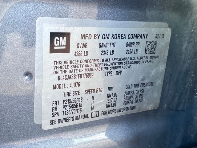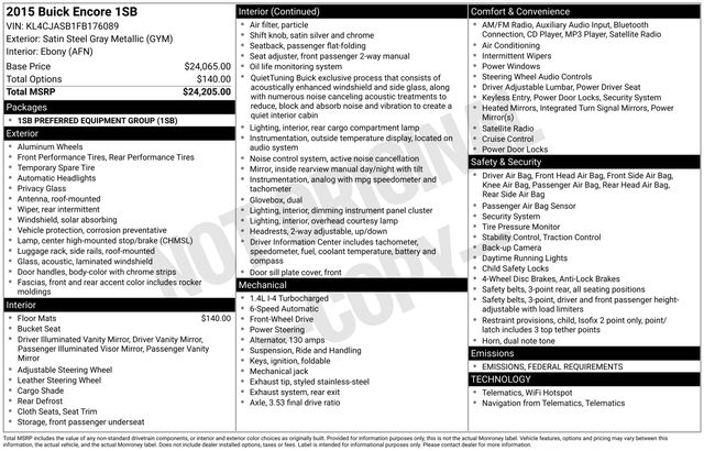 2-Way Manual Front Passenger Seat Adjuster, 3.53 Final Drive Axle Ratio, 4-Wheel Disc Brakes, 6 Speakers, 6-Way Power Driver Seat Adjuster, ABS brakes, Air Conditioning, Alloy wheels, AM/FM radio: SiriusXM, Brake assist, Bumpers: body-color, CD player, Compass, Delay-off headlights, Driver door bin, Driver vanity mirror, Driver's Seat Mounted Armrest, Dual front impact airbags, Dual front side impact airbags, Electronic Stability Control, Emergency communication system: OnStar Directions & Connections, Exterior Parking Camera Rear, Front & Rear All Weather Floor Mats (LPO), Front anti-roll bar, Front Bucket Seats, Front reading lights, Front wheel independent suspension, Fully automatic headlights, Heated door mirrors, Illuminated entry, Knee airbag, Leather steering wheel, Low tire pressure warning, Occupant sensing airbag, Outside temperature display, Overhead airbag, Panic alarm, Passenger door bin, Passenger vanity mirror, Power door mirrors, Power driver seat, Power steering, Power windows, Preferred Equipment Group 1SB, Premium audio system: IntelliLink, Radio data system, Radio: AM/FM Audio System w/MP3 CD Player, Rear seat center armrest, Rear side impact airbag, Rear window defroster, Rear window wiper, Remote keyless entry, Ride & Handling Suspension, Roof rack: rails only, Security system, SiriusXM Satellite Radio, Speed control, Speed-sensing steering, Split folding rear seat, Spoiler, Steering wheel mounted audio controls, Tachometer, Telescoping steering wheel, Tilt steering wheel, Traction control, Trip computer, Turn signal indicator mirrors, Upscale Cloth w/Leatherette Accents Seat Trim, Variably intermittent wipers, Wheels: 18" 5-Spoke Painted Cast Aluminum.