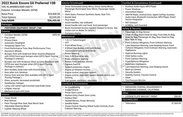 2 USB Ports w/Auxiliary Input Jack, 3 Years of OnStar & Connected Services Plan (DISC), 4-Way Manual Passenger Seat Adjuster, 4-Wheel Disc Brakes, 5.45 Final Drive Axle Ratio, 6 Speakers, 6-Way Manual Driver Seat Adjuster, ABS brakes, Air Conditioning, Alloy wheels, AM/FM radio: SiriusXM, Auto High-beam Headlights, Automatic temperature control, Brake assist, Bumpers: body-color, Cloth w/Leatherette Seat Trim, Compass, Delay-off headlights, Driver door bin, Driver vanity mirror, Dual front impact airbags, Dual front side impact airbags, Electronic Stability Control, Emergency communication system: OnStar and Buick connected services capable, Enhanced Performance 6-Speaker System, Front anti-roll bar, Front Bucket Seats, Front Center Armrest, Front fog lights, Front License Plate Bracket, Front reading lights, Front wheel independent suspension, Fully automatic headlights, Heated door mirrors, Illuminated entry, Knee airbag, Low tire pressure warning, Occupant sensing airbag, Outside temperature display, Overhead airbag, Overhead console, Panic alarm, Passenger door bin, Passenger vanity mirror, Power door mirrors, Power steering, Power windows, Preferred Equipment Group 1SB, Radio data system, Radio: 8" Diagonal Buick Infotainment System, Rear reading lights, Rear side impact airbag, Rear window defroster, Rear window wiper, Remote keyless entry, Ride & Handling Suspension, Security system, SiriusXM Radio, Speed control, Speed-sensing steering, Split folding rear seat, Spoiler, Steering wheel mounted audio controls, Tachometer, Telescoping steering wheel, Tilt steering wheel, Traction control, Trip computer, Variably intermittent wipers, Wheels: 18" Bright Silver Painted Aluminum, Wireless Apple CarPlay/Wireless Android Auto.