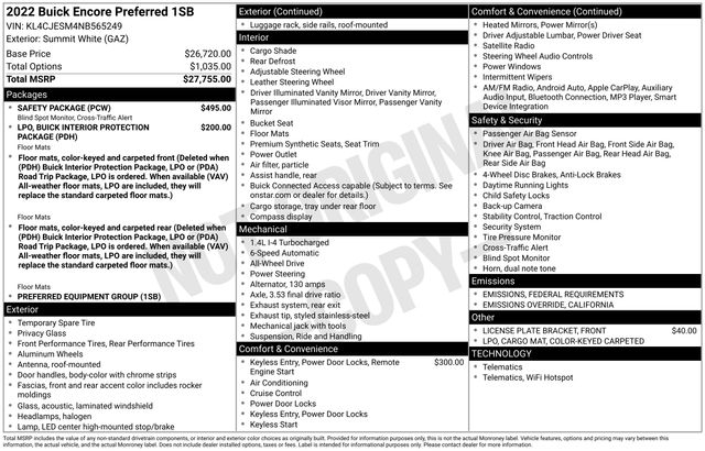 120-Volt Power Outlet, Alloy wheels, Apple CarPlay/Android Auto, Exterior Parking Camera Rear, Preferred Equipment Group 1SB, Rear Cross Traffic Alert, Safety Package, Side Blind Zone Alert, Speed control, 18" Aluminum Wheels, 2-Way Manual Front Passenger Seat Adjuster, 3.53 Final Drive Axle Ratio, 4-Wheel Disc Brakes, 6 Speakers, 6-Speaker Audio System, 6-Way Power Driver Seat Adjuster, ABS brakes, Air Conditioning, All-Weather Floor Mats, AM/FM radio: SiriusXM, Brake assist, Bumpers: body-color, Cloth w/Leatherette Seat Trim, Compass, Delay-off headlights, Driver door bin, Driver vanity mirror, Driver's Seat Mounted Armrest, Dual front impact airbags, Dual front side impact airbags, Electronic Stability Control, Emergency communication system: OnStar and Buick connected services capable, Front anti-roll bar, Front Bucket Seats, Front License Plate Bracket, Front reading lights, Front wheel independent suspension, Fully automatic headlights, Heated door mirrors, Illuminated entry, Knee airbag, Leather steering wheel, Low tire pressure warning, Occupant sensing airbag, Outside temperature display, Overhead airbag, Panic alarm, Passenger door bin, Passenger vanity mirror, Power door mirrors, Power driver seat, Power steering, Power windows, Radio data system, Radio: 7" Diagonal Buick Infotainment System, Rear seat center armrest, Rear side impact airbag, Rear window defroster, Rear window wiper, Remote keyless entry, Remote Vehicle Starter System, Ride & Handling Suspension, Roof rack: rails only, Security system, SiriusXM Radio, Speed-sensing steering, Split folding rear seat, Spoiler, Steering wheel mounted audio controls, Tachometer, Telescoping steering wheel, Tilt steering wheel, Traction control, Trip computer, Variably intermittent wipers, One Owner Clean Carfax, ALL WHEEL DRIVE, 120-Volt Power Outlet, Alloy wheels, Apple CarPlay/Android Auto, Exterior Parking Camera Rear, Preferred Equipment Group 1SB, Rear Cross Traffic Alert, Safety Package, Side Blind Zone Alert, Speed control.
