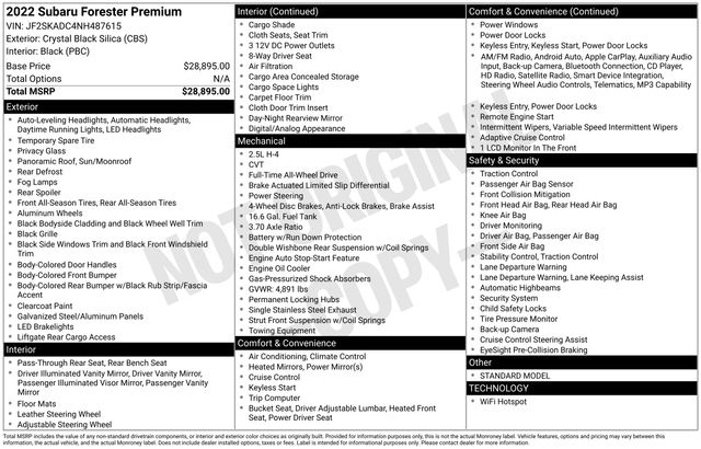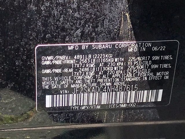 Exterior Parking Camera Rear, Heated door mirrors, Heated front seats, Power moonroof: Panoramic, Radio: Subaru Starlink 6.5" Multimedia Plus System, Speed control, STARLINK/Apple CarPlay/Android Auto, 3.70 Axle Ratio, 4-Wheel Disc Brakes, 6 Speakers, ABS brakes, Air Conditioning, Alloy wheels, AM/FM radio: SiriusXM, Anti-whiplash front head restraints, Auto High-beam Headlights, Automatic temperature control, Brake assist, Bumpers: body-color, CD player, Driver door bin, Driver vanity mirror, Dual front impact airbags, Dual front side impact airbags, Electronic Stability Control, Emergency communication system: STARLINK Safety and Security (Subscription Required), Four wheel independent suspension, Front anti-roll bar, Front Bucket Seats, Front Center Armrest, Front fog lights, Front reading lights, Fully automatic headlights, Heated Front Bucket Seats, Illuminated entry, Knee airbag, Low tire pressure warning, Occupant sensing airbag, Outside temperature display, Overhead airbag, Overhead console, Panic alarm, Passenger door bin, Passenger vanity mirror, Power door mirrors, Power driver seat, Power steering, Power windows, Premium Cloth Upholstery, Radio data system, Rear anti-roll bar, Rear seat center armrest, Rear window defroster, Rear window wiper, Remote keyless entry, Roof rack: rails only, Security system, Speed-sensing steering, Split folding rear seat, Spoiler, Standard Model, Steering wheel mounted audio controls, Tachometer, Telescoping steering wheel, Tilt steering wheel, Traction control, Trip computer, Variably intermittent wipers, Wheels: 17" x 7.0J Black Machine Finish Alloy, One Owner Clean Carfax, ALL WHEEL DRIVE, Exterior Parking Camera Rear, Heated door mirrors, Heated front seats, Power moonroof: Panoramic, Radio: Subaru Starlink 6.5" Multimedia Plus System, Speed control, STARLINK/Apple CarPlay/Android Auto.