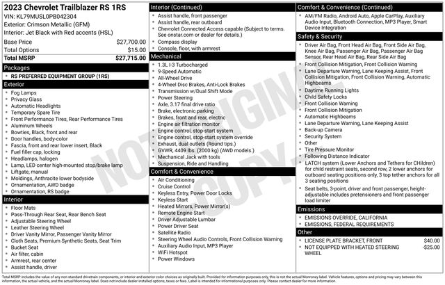 2-Way Adjustable Front Head Restraints, 2-Way Power Driver Lumbar Seat Adjuster, 3.17 Axle Ratio, 4-Way Manual Front Passenger Seat Adjuster, 4-Wheel Disc Brakes, 6 Speakers, 6-Speaker Audio System Feature w/Amplifier, 7" Diagonal Color Touchscreen, 8-Way Power Driver Seat Adjuster, ABS brakes, Air Conditioning, Alloy wheels, AM/FM radio: SiriusXM, Auto High-beam Headlights, Brake assist, Bumpers: body-color, Cloth w/Leatherette Seat Trim, Compass, Delay-off headlights, Driver door bin, Driver vanity mirror, Dual front impact airbags, Dual front side impact airbags, Electronic Stability Control, Emergency communication system: OnStar and Chevrolet connected services capable, Exterior Parking Camera Rear, Flat-Folding Front Passenger Seatback, Front anti-roll bar, Front Bucket Seats, Front Center Armrest, Front fog lights, Front License Plate Bracket, Front reading lights, Front wheel independent suspension, Fully automatic headlights, Heated door mirrors, Heated Driver & Front Passenger Seats, Heated front seats, Heated Steering Wheel, Heated steering wheel, Illuminated entry, Knee airbag, Leather Shift Knob, Leather steering wheel, Low tire pressure warning, Mosaic Black Metallic Two-Tone Roof, Not Equipped w/Heated Steering Wheel, Occupant sensing airbag, Overhead airbag, Overhead console, Panic alarm, Passenger door bin, Passenger vanity mirror, Power door mirrors, Power driver seat, Power steering, Power windows, Preferred Equipment Group 1RS, Radio data system, Radio: Chevrolet Infotainment 3 System, Rear seat center armrest, Rear side impact airbag, Rear window defroster, Rear window wiper, Remote keyless entry, Ride & Handling Suspension, Security system, SiriusXM Radio, Speed control, Split folding rear seat, Spoiler, Steering wheel mounted audio controls, Tachometer, Telescoping steering wheel, Tilt steering wheel, Traction control, Trip computer, Variably intermittent wipers, Wheels: 18" High Gloss Black Machined Aluminum, Wireless Apple CarPlay/Android Auto.