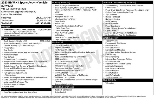 Connected Package Pro, Navigation System, 12 Speakers, 3.385 Axle Ratio, 4-Wheel Disc Brakes, ABS brakes, Air Conditioning, Alloy wheels, AM/FM Radio, AM/FM radio: SiriusXM, Apple CarPlay & Android Auto Compatibility, Auto High-beam Headlights, Auto-dimming door mirrors, Auto-dimming Rear-View mirror, Automatic temperature control, BMW Assist eCall, BMW TeleServices, Brake assist, Bumpers: body-color, ConnectedDrive Services, Delay-off headlights, Driver door bin, Driver vanity mirror, Dual front impact airbags, Dual front side impact airbags, Electronic Stability Control, Emergency communication system: BMW Assist eCall, Enhanced USB & Bluetooth w/Smartphone Integration, Exterior Parking Camera Rear, Four wheel independent suspension, Front anti-roll bar, Front Bucket Seats, Front Center Armrest, Front dual zone A/C, Front reading lights, Fully automatic headlights, Garage door transmitter, Genuine wood dashboard insert, Genuine wood door panel insert, Heated door mirrors, Hi-Fi Sound System, Illuminated entry, Knee airbag, Low tire pressure warning, Memory seat, Navigation, Occupant sensing airbag, Outside temperature display, Overhead airbag, Panic alarm, Passenger door bin, Passenger vanity mirror, Perforated SensaTec Upholstery, Power door mirrors, Power driver seat, Power Front Seats, Power Liftgate, Power passenger seat, Power steering, Power windows, Radio data system, Rain sensing wipers, Rear air conditioning, Rear anti-roll bar, Rear reading lights, Rear seat center armrest, Rear window defroster, Rear window wiper, Remote keyless entry, Security system, SiriusXM Satellite Radio, Speed control, Speed-sensing steering, Speed-Sensitive Wipers, Split folding rear seat, Spoiler, Sport Seats, Sport steering wheel, Steering wheel mounted audio controls, Tachometer, Telescoping steering wheel, Tilt steering wheel, Traction control, Trip computer, Turn signal indicator mirrors, Variably intermittent wipers, Wheels: 19" x 7.5" Y-Spoke (Style 693), WiFi Hotspot, Connected Package Pro, Navigation System.