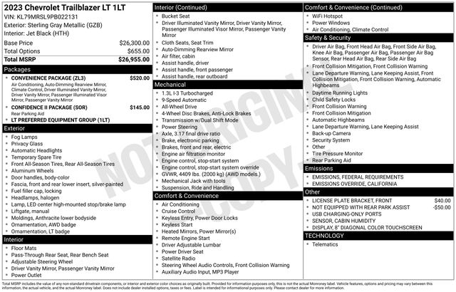 1 Type-A & 1 Type-C USB Charging-Only Ports, 120-Volt Power Outlet, 8" Diagonal Color Touchscreen Display, Confidence II Package, Convenience Package, Driver & Front Passenger Illuminated Vanity Mirrors, Inside Rear-View Auto-Dimming Mirror, Rear Park Assist, Single-Zone Auto Climate Control Air Conditioning, 2-Way Adjustable Front Head Restraints, 2-Way Power Driver Lumbar Seat Adjuster, 3.17 Axle Ratio, 4-Way Manual Front Passenger Seat Adjuster, 4-Wheel Disc Brakes, 6 Speakers, 6-Speaker Audio System Feature w/Amplifier, 7" Diagonal Color Touchscreen, 8-Way Power Driver Seat Adjuster, ABS brakes, Air Conditioning, Alloy wheels, AM/FM radio: SiriusXM, Auto High-beam Headlights, Brake assist, Bumpers: body-color, Cabin Humidity Sensor, Cloth Seat Trim, Compass, Delay-off headlights, Driver door bin, Driver vanity mirror, Dual front impact airbags, Dual front side impact airbags, Electronic Stability Control, Emergency communication system: OnStar and Chevrolet connected services capable, Exterior Parking Camera Rear, Flat-Folding Front Passenger Seatback, Front anti-roll bar, Front Bucket Seats, Front Center Armrest, Front fog lights, Front License Plate Bracket, Front reading lights, Front wheel independent suspension, Fully automatic headlights, Heated door mirrors, Heated Driver & Front Passenger Seats, Heated front seats, Illuminated entry, Knee airbag, Low tire pressure warning, Not Equipped w/Rear Park Assist, Occupant sensing airbag, Overhead airbag, Overhead console, Panic alarm, Passenger door bin, Passenger vanity mirror, Power door mirrors, Power driver seat, Power steering, Power windows, Preferred Equipment Group 1LT, Radio data system, Radio: Chevrolet Infotainment 3 System, Rear side impact airbag, Rear window defroster, Rear window wiper, Remote keyless entry, Ride & Handling Suspension, Security system, SiriusXM Radio, Speed control, Split folding rear seat, Spoiler, Steering wheel mounted audio controls, Tachometer, Telescoping steering wheel, Tilt steering wheel, Traction control, Trip computer, Variably intermittent wipers, Wheels: 17" High Gloss Black Machined Aluminum, Wireless Apple CarPlay/Android Auto, 1 Type-A & 1 Type-C USB Charging-Only Ports, 120-Volt Power Outlet, 8" Diagonal Color Touchscreen Display, Confidence II Package, Convenience Package, Driver & Front Passenger Illuminated Vanity Mirrors, Inside Rear-View Auto-Dimming Mirror, Rear Park Assist, Single-Zone Auto Climate Control Air Conditioning.