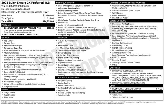 2-Way Power Driver Lumbar Control, 8-Way Power Driver Seat Adjuster, Cold Weather Comfort Package, Heated Driver & Front Passenger Seats, Preferred Equipment Group 1SB, Remote Vehicle Starter System, Speed control, 2 USB Ports w/Auxiliary Input Jack, 4-Way Manual Passenger Seat Adjuster, 4-Wheel Disc Brakes, 5.45 Final Drive Axle Ratio, 6 Speakers, 6-Way Manual Driver Seat Adjuster, ABS brakes, Air Conditioning, Alloy wheels, AM/FM radio: SiriusXM, Auto High-beam Headlights, Automatic temperature control, Brake assist, Bumpers: body-color, Cloth w/Leatherette Seat Trim, Compass, Delay-off headlights, Driver door bin, Driver vanity mirror, Dual front impact airbags, Dual front side impact airbags, Electronic Stability Control, Emergency communication system: OnStar and Buick connected services capable, Enhanced Performance 6-Speaker System, Front anti-roll bar, Front Bucket Seats, Front Center Armrest, Front fog lights, Front License Plate Bracket, Front reading lights, Front wheel independent suspension, Fully automatic headlights, Heated door mirrors, Illuminated entry, Knee airbag, Low tire pressure warning, Occupant sensing airbag, Outside temperature display, Overhead airbag, Overhead console, Panic alarm, Passenger door bin, Passenger vanity mirror, Power door mirrors, Power steering, Power windows, Radio data system, Radio: 8" Diagonal Buick Infotainment System, Rear reading lights, Rear side impact airbag, Rear window defroster, Rear window wiper, Remote keyless entry, Ride & Handling Suspension, Security system, SiriusXM Radio, Speed-sensing steering, Split folding rear seat, Spoiler, Steering wheel mounted audio controls, Tachometer, Telescoping steering wheel, Tilt steering wheel, Traction control, Trip computer, Variably intermittent wipers, Wheels: 18" Bright Silver Painted Aluminum, Wireless Apple CarPlay/Wireless Android Auto, One Owner Clean Carfax, 2-Way Power Driver Lumbar Control, 8-Way Power Driver Seat Adjuster, Cold Weather Comfort Package, Heated Driver & Front Passenger Seats, Preferred Equipment Group 1SB, Remote Vehicle Starter System, Speed control.