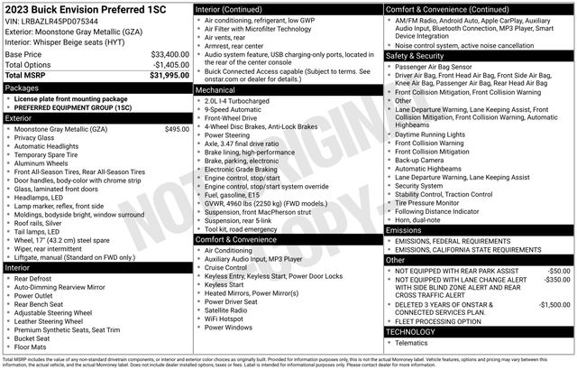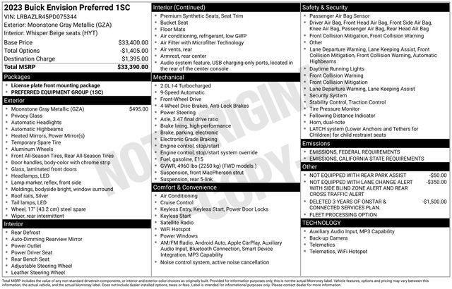 3.47 Final Drive Axle Ratio, 4-Wheel Disc Brakes, 6 Speakers, 6-Speaker Audio System Feature, 8-Way Power Driver Seat Adjuster, ABS brakes, Air Conditioning, Alloy wheels, AM/FM radio: SiriusXM, Apple CarPlay/Android Auto, Auto High-beam Headlights, Auto-dimming door mirrors, Auto-dimming Rear-View mirror, Automatic Emergency Braking, Brake assist, Bumpers: body-color, Cloth w/Leatherette Seat Trim, Compass, Delay-off headlights, Deleted 3 Years of OnStar & Connected Services Plan, Driver door bin, Driver vanity mirror, Dual front impact airbags, Dual front side impact airbags, Electronic Stability Control, Emergency communication system: OnStar and Buick connected services capable, Following Distance Indicator, Forward Collision Alert, Four wheel independent suspension, Front anti-roll bar, Front Bin Center Console USB Ports, Front Bucket Seats, Front Center Armrest, Front Passenger 6-Way Manual Seat Adjuster, Front Pedestrian Braking, Front reading lights, Fully automatic headlights, Heated door mirrors, Illuminated entry, IntelliBeam Headlamp Control w/Auto High Beam, Knee airbag, Lane Keep Assist w/Lane Departure Warning, Low tire pressure warning, Not Equipped w/Lane Change & Rear Cross Traffic Alerts, Not Equipped w/Rear Park Assist, Occupant sensing airbag, Outside temperature display, Overhead airbag, Overhead console, Panic alarm, Passenger door bin, Passenger vanity mirror, Power door mirrors, Power driver seat, Power steering, Power windows, Preferred Equipment Group 1SC, Premium audio system: Buick Infotainment System, Radio data system, Radio: 8" Diagonal Buick Infotainment System, Rear anti-roll bar, Rear reading lights, Rear seat center armrest, Rear window defroster, Rear window wiper, Remote keyless entry, Security system, SiriusXM Radio, Speed control, Split folding rear seat, Spoiler, Steering wheel mounted audio controls, Telescoping steering wheel, Tilt steering wheel, Traction control, Trip computer, USB Charging-Only Ports, Variably intermittent wipers, Wheels: 18" Aluminum w/Light Charcoal Met Finish, Wireless Apple CarPlay/Wireless Android Auto.