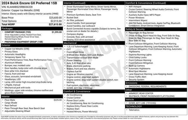 2-Way Power Driver Lumbar Control, 8-Way Power Driver Seat Adjuster, All-Weather Floor Liners (LPO), Comfort Package, Flat-Folding Front Passenger Seatback, Heated Driver & Front Passenger Seats, Heated Steering Wheel, Rear Center Armrest, Remote Vehicle Starter System, Speed control, Wheels: 18" Bright Silver Painted Aluminum, 2 USB Ports (1 Type-A, 1 Type-C), 4-Way Manual Passenger Seat Adjuster, 4-Wheel Disc Brakes, 5.45 Final Drive Axle Ratio, 6 Speakers, 6-Way Manual Driver Seat Adjuster, ABS brakes, Air Conditioning, Alloy wheels, AM/FM radio: SiriusXM, Auto High-beam Headlights, Automatic temperature control, Brake assist, Bumpers: body-color, Cloth w/Leatherette Seat Trim, Compass, Delay-off headlights, Driver door bin, Driver vanity mirror, Dual front impact airbags, Dual front side impact airbags, Electronic Stability Control, Emergency communication system: OnStar and Buick connected services capable, Enhanced Performance 6-Speaker System, Front anti-roll bar, Front Bucket Seats, Front Center Armrest, Front reading lights, Front wheel independent suspension, Fully automatic headlights, Heated door mirrors, Illuminated entry, Knee airbag, Low tire pressure warning, Occupant sensing airbag, Outside temperature display, Overhead airbag, Overhead console, Panic alarm, Passenger door bin, Passenger vanity mirror, Power door mirrors, Power steering, Power windows, Preferred Equipment Group 1SB, Radio data system, Radio: Audio System w/AM/FM, Rear reading lights, Rear side impact airbag, Rear window defroster, Rear window wiper, Remote keyless entry, Ride & Handling Suspension, Security system, SiriusXM, Speed-sensing steering, Split folding rear seat, Spoiler, Steering wheel mounted audio controls, Tachometer, Telescoping steering wheel, Tilt steering wheel, Traction control, Trip computer, Variably intermittent wipers, Wireless Apple CarPlay/Wireless Android Auto, One Owner Clean Carfax, 2-Way Power Driver Lumbar Control, 8-Way Power Driver Seat Adjuster, All-Weather Floor Liners (LPO), Comfort Package, Flat-Folding Front Passenger Seatback, Heated Driver & Front Passenger Seats, Heated Steering Wheel, Rear Center Armrest, Remote Vehicle Starter System, Speed control, Wheels: 18" Bright Silver Painted Aluminum.