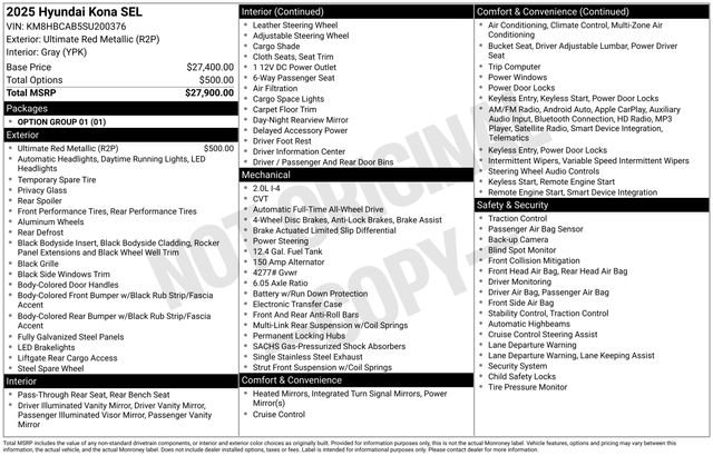 Apple CarPlay & Android Auto, Exterior Parking Camera Rear, Radio: AM/FM/HD Radio/SiriusXM Audio System, Speed control, Wheels: 18" x 7.0J Glossy Black Alloy, 4-Wheel Disc Brakes, 6 Speakers, ABS brakes, Air Conditioning, Alloy wheels, AM/FM radio: SiriusXM, Auto High-beam Headlights, Automatic temperature control, Brake assist, Bumpers: body-color, Cloth Seat Trim, Delay-off headlights, Driver door bin, Driver vanity mirror, Dual front impact airbags, Dual front side impact airbags, Electronic Stability Control, Emergency communication system: Bluelink+, Four wheel independent suspension, Front anti-roll bar, Front Bucket Seats, Front Center Armrest, Front dual zone A/C, Front reading lights, Fully automatic headlights, Heated door mirrors, Illuminated entry, Leather steering wheel, Low tire pressure warning, Occupant sensing airbag, Option Group 01, Outside temperature display, Overhead airbag, Panic alarm, Passenger door bin, Passenger vanity mirror, Power door mirrors, Power driver seat, Power steering, Power windows, Rear anti-roll bar, Rear seat center armrest, Rear window defroster, Rear window wiper, Remote keyless entry, Security system, Speed-sensing steering, Split folding rear seat, Spoiler, Steering wheel mounted audio controls, Tachometer, Telescoping steering wheel, Tilt steering wheel, Traction control, Trip computer, Turn signal indicator mirrors, Variably intermittent wipers, One Owner Clean Carfax, ALL WHEEL DRIVE, Apple CarPlay & Android Auto, Exterior Parking Camera Rear, Radio: AM/FM/HD Radio/SiriusXM Audio System, Speed control, Wheels: 18" x 7.0J Glossy Black Alloy.