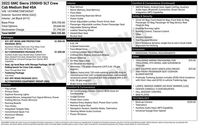 Sierra 2500HD SLT, 6.6L V8, 2 USB Ports, 2 USB Ports (1st Row), 20" Machined Aluminum Wheels, All-Weather Floor Liners (LPO), Floor-Mounted Center Console, Front Bucket Seats, Heated & Ventilated Front Bucket Seats, Heated 2nd Row Outboard Seats, Hill Descent Control, LED Smoked Amber Roof Marker Lamps, Off-Road Suspension, Power Sliding Rear Window w/Defogger, SLT Convenience Package, Spray-On Pickup Box Bed Liner w/GMC Logo, Universal Home Remote, X31 Off-Road & Protection Package, X31 Off-Road Package, 10-Way Power Driver Seat Adjuster w/Lumbar, 10-Way Power Passenger Seat Adjuster w/Lumbar, 12-Volt Rear Auxiliary Power Outlet, 120-Volt Bed Mounted Power Outlet, 120-Volt Instrument Panel Power Outlet, 18" Machined Aluminum Wheels, 2-Speed Active Transfer Case, 2nd Row Dual USB Charge-Only Ports, 3.73 Rear Axle Ratio, 4-Wheel Disc Brakes, 4.2" Diagonal Color Display Driver Info Center, 5th Wheel & Gooseneck Trailer Wiring Provisions, 6 Speakers, 6-Speaker Audio System Feature, ABS brakes, Air Conditioning, Alloy wheels, AM/FM radio: SiriusXM with 360L, Apple CarPlay/Android Auto, Auto-dimming door mirrors, Auto-dimming Rear-View mirror, Automatic temperature control, Bed View Camera w/2 Trailer Camera Provisions, Brake assist, Bumpers: chrome, Chrome Surround Grille w/High Gloss Black Mesh, Compass, Compass Located In Instrument Cluster, Deep-Tinted Glass, Delay-off headlights, Driver door bin, Driver Memory, Driver vanity mirror, Dual front impact airbags, Dual front side impact airbags, Electric Rear-Window Defogger, Electrical Lock Control Steering Column, Electronic Stability Control, Emergency communication system: OnStar and GMC Connected Services capable, Front 40/20/40 Split-Bench Seats w/Lockable Storage, Front anti-roll bar, Front Center Armrest w/Storage, Front dual zone A/C, Front fog lights, Front reading lights, Front wheel independent suspension, Fully automatic headlights, GMC Connected Access Capable, Heated door mirrors, Heated Driver & Front Outboard Passenger Seats, Heated front seats, Heated steering wheel, Heavy-Duty 80 Amp Battery, Hitch Guidance w/Hitch View, Illuminated entry, In-Vehicle Trailering System App, Integrated Trailer Brake Controller, Keyless Open & Start, LED Cargo Area Lighting, Low tire pressure warning, Manual Tilt-Wheel/Telescoping Steering Column, Memory seat, Not Equip w/Heat & Vent Seat Cushion Blower Motor, Occupant sensing airbag, OnStar & GMC Connected Services Capable, Outside temperature display, Overhead airbag, Overhead console, Panic alarm, Passenger door bin, Passenger vanity mirror, Perf Leather-Appointed Front Outboard Seat Trim, Pickup Box, Power Door Locks, Power door mirrors, Power driver seat, Power Front Passenger Windows w/Express Up/Down, Power passenger seat, Power Rear Windows w/Express Down, Power steering, Power windows, Power Windows w/Driver Express Up/Down, Preferred Equipment Group 4SA, Premium audio system: Premium GMC Infotainment System, Radio: AM/FM w/Premium GMC Infotainment System, Rear reading lights, Rear seat center armrest, Rear step bumper, Rear Wheelhouse Liners, Rear window defroster, Remote keyless entry, Remote Vehicle Starter System, Security system, SiriusXM w/360L, Speed control, Speed-sensing steering, Split folding rear seat, Steering Wheel Audio Controls, Steering wheel mounted audio controls, Suspension Package, Tachometer, Telescoping steering wheel, Tilt steering wheel, Traction control, Trip computer, Turn signal indicator mirrors, Unauthorized Entry Theft-Deterrent System, Variably intermittent wipers, Voltmeter, Wi-Fi Hotspot Capable, Wireless Phone Projection, Sierra 2500HD SLT, 6.6L V8, 2 USB Ports, 2 USB Ports (1st Row), 20" Machined Aluminum Wheels, All-Weather Floor Liners (LPO), Floor-Mounted Center Console, Front Bucket Seats, Heated & Ventilated Front Bucket Se