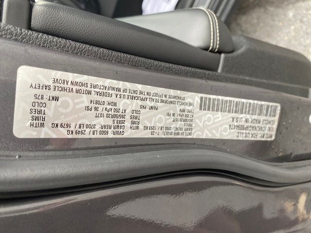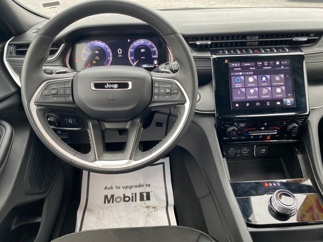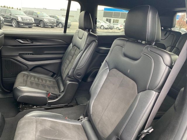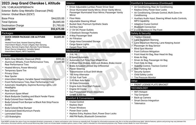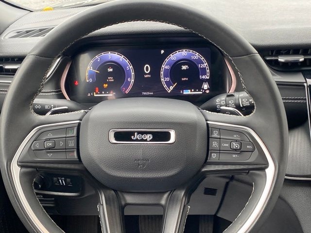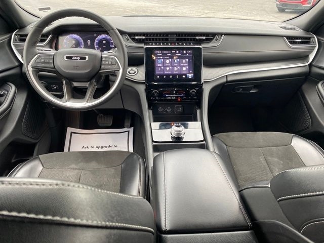 115V Auxiliary Power Outlet, 3.45 Rear Axle Ratio, 3rd Row Charge-Only USB Ports, 3rd row seats: split-bench, 4-Wheel Disc Brakes, 6 Speakers, ABS brakes, Air Conditioning, Alloy wheels, Altitude Appearance Package, Anti-whiplash front head restraints, Automatic temperature control, Black Headliner, Brake assist, Bumpers: body-color, Capri Leatherette/Suede Seats, Cloth Seats, Compass, Delay-off headlights, Delete Laredo Badge, Driver door bin, Driver vanity mirror, Dual front impact airbags, Dual front side impact airbags, Electronic Stability Control, Emergency communication system, Four wheel independent suspension, Front anti-roll bar, Front Bucket Seats, Front Center Armrest w/Storage, Front dual zone A/C, Front License Plate Bracket, Front reading lights, Fully automatic headlights, Gloss Black Exterior Accents, Heated door mirrors, Heated Front Seats, Heated Steering Wheel, Illuminated entry, Knee airbag, Low tire pressure warning, Manual Fold Seatbacks, Molded In Color Black/Gloss Black Roof Rails, Normal Duty Suspension, Occupant sensing airbag, Outside temperature display, Overhead airbag, Overhead console, Panic alarm, ParkView Rear Back-Up Camera, Passenger door bin, Passenger vanity mirror, Power door mirrors, Power driver seat, Power Liftgate, Power steering, Power windows, Quick Order Package 23B Altitude, Radio data system, Radio: Uconnect 5 w/8.4" Display, Rain Sensitive Windshield Wipers, Rear air conditioning, Rear anti-roll bar, Rear reading lights, Rear window defroster, Rear window wiper, Reclining 3rd row seat, Remote keyless entry, Remote Start System, Security system, Selectable Tire Fill Alert, Speed control, Speed-Sensitive Wipers, Split folding rear seat, Spoiler, Steering wheel mounted audio controls, Tachometer, Telescoping steering wheel, Tilt steering wheel, Traction control, Trip computer, Variably intermittent wipers, Voltmeter, Wheels: 18" x 8.0" Fully Painted Aluminum, Wheels: 18" x 8.0" Fully Painted Aluminum 1, Wheels: 20" x 8.5" Gloss Black Painted Aluminum, Wireless Charging Pad.