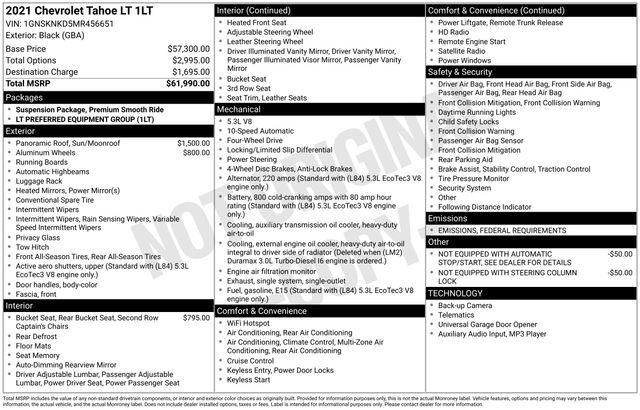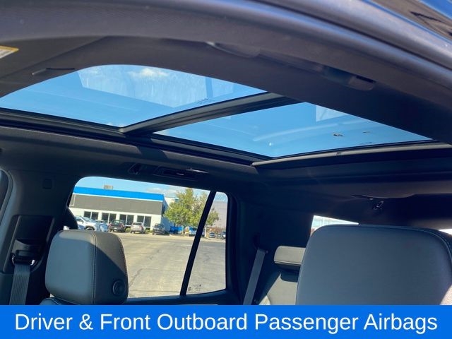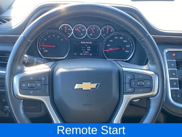 1st & 2nd Row Color-Keyed Carpeted Floor Mats, 2 USB Data Ports, Apple CarPlay/Android Auto, Auto-Dimming Inside Rear-View Mirror, Bright Front & Rear Door Sill Plates, Color-Keyed Carpeting Floor Covering, Driver & Front Outboard Passenger Airbags, Dual-Pane Power Panoramic Sunroof, Floor Console w/Storage Area, Hands-Free Rear Power Programmable Liftgate, HD Radio, Infotainment Display, Leather-Wrapped Steering Wheel, LED Daytime Running Lamps, Memory Settings for Driver, Power Liftgate, Preferred Equipment Group 1LT, Remote Start, SiriusXM Radio w/360L, Speed control, Universal Home Remote, Wheels: 20" x 9" Painted Aluminum, 10-Way Power Driver & Passenger Seat Adjusters, 2nd Row Manual Bucket Seats, 3.23 Rear Axle Ratio, 3rd row seats: split-bench, 4-Wheel Disc Brakes, 9 Speakers, ABS brakes, Air Conditioning, Alloy wheels, AM/FM radio: SiriusXM with 360L, Auto High-beam Headlights, Auto-dimming Rear-View mirror, Automatic temperature control, Bose 9-Speaker Stereo Audio System Feature, Brake assist, Bumpers: body-color, Compass, Delay-off headlights, Driver door bin, Driver vanity mirror, Dual front impact airbags, Dual front side impact airbags, Electronic Stability Control, Emergency communication system: OnStar and Chevrolet connected services capable, Four wheel independent suspension, Front anti-roll bar, Front Bucket Seats, Front Center Armrest, Front dual zone A/C, Front High-Back Reclining Bucket Seats, Front reading lights, Fully automatic headlights, Garage door transmitter, Heated door mirrors, Heated Driver & Front Passenger Seats, Heated front seats, Illuminated entry, Leather Seat Trim, Leather steering wheel, Low tire pressure warning, Memory seat, Not Equipped w/Automatic Stop/Start, Not Equipped w/Steering Column Lock, Occupant sensing airbag, Outside temperature display, Overhead airbag, Overhead console, Panic alarm, Passenger door bin, Passenger vanity mirror, Power door mirrors, Power driver seat, Power passenger seat, Power steering, Power windows, Premium audio system: Chevrolet Infotainment 3, Premium Smooth Ride Suspension, Radio: Chevrolet Infotainment 3 Plus System, Rain sensing wipers, Rear air conditioning, Rear anti-roll bar, Rear reading lights, Rear seat center armrest, Rear window defroster, Rear window wiper, Remote keyless entry, Roof rack: rails only, Security system, Speed-sensing steering, Split folding rear seat, Spoiler, Steering wheel mounted audio controls, Tachometer, Telescoping steering wheel, Tilt steering wheel, Traction control, Trip computer, Variably intermittent wipers, Voltmeter, Wheels: 18" x 8.5" Bright Silver Painted Aluminum, One Owner Clean Carfax, 5.3L V-8 ENGINE, 1st & 2nd Row Color-Keyed Carpeted Floor Mats, 2 USB Data Ports, Apple CarPlay/Android Auto, Auto-Dimming Inside Rear-View Mirror, Bright Front & Rear Door Sill Plates, Color-Keyed Carpeting Floor Covering, Driver & Front Outboard Passenger Airbags, Dual-Pane Power Panoramic Sunroof, Floor Console w/Storage Area, Hands-Free Rear Power Programmable Liftgate, HD Radio, Infotainment Display, Leather-Wrapped Steering Wheel, LED Daytime Running Lamps, Memory Settings for Driver, Power Liftgate, Preferred Equipment Group 1LT, Remote Start, SiriusXM Radio w/360L, Speed control, Universal Home