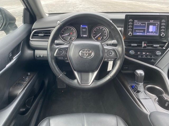 The interior of this Camry SE is equally impressive, with features like dual-zone automatic climate control, a power driver's seat, and a leather-wrapped steering wheel that create a refined and comfortable driving environment. The spacious cabin and generous cargo capacity make it an ideal choice for families or those with active lifestyles.