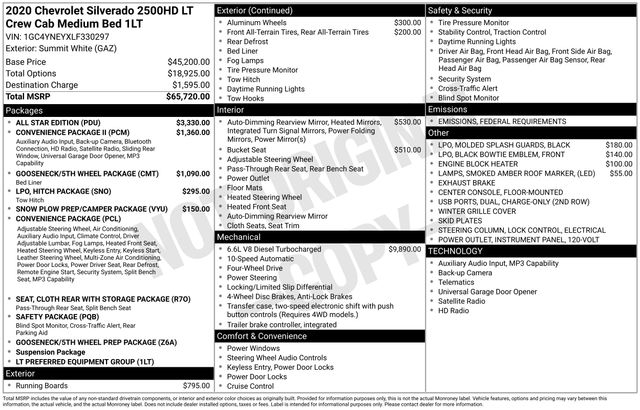 10-Way Power Driver Seat Adjuster w/Lumbar, 12-Volt Rear Auxiliary Power Outlet, 120-Volt Bed Mounted Power Outlet, 120-Volt Instrument Panel Power Outlet, 17" Machined Aluminum Wheels, 170 Amp Alternator, 2 USB Ports (1st Row), 2 USB Ports & 1 SD Card Reader (1st Row), 2-Speed Electronic Shift Transfer Case, 220 Amp Alternator, 4-Way Manual Driver Seat Adjuster, 4-Wheel Disc Brakes, 4.2" Diagonal Color Display DIC, 4G LTE Wi-Fi Hotspot Capable, 6 Speakers, 6-Speaker Audio System, 6" Rectangular Chromed Tubular Assist Steps, 720 Cold-Cranking Amps Heavy-Duty Battery, ABS brakes, Advanced Trailering System, Air Conditioning, All Star Edition, Alloy wheels, AM/FM radio, Apple CarPlay/Android Auto, Auto-Dimming Inside Rear-View Mirror, Black Chevytec Spray-On Bedliner w/Chevrolet Logo, Black Mirror Caps, Black Molded Splash Guards (LPO), Bluetooth® For Phone, Brake assist, Bumpers: chrome, Chevrolet Connected Access Capable, Chrome Front Grille, Cloth Rear Seat w/Storage Package, Cloth Seat Trim, Color-Keyed Carpeting Floor Covering, Compass, Convenience Package, Convenience Package II, Deep-Tinted Glass, Delay-off headlights, Driver door bin, Driver vanity mirror, Dual Charge-Only USB Ports (2nd Row), Dual front impact airbags, Dual front side impact airbags, Dual-Zone Automatic Climate Control, Electric Rear-Window Defogger, Electrical Lock Control Steering Column, Electronic Cruise Control w/Set & Resume Speed, Electronic Stability Control, Engine Block Heater, Exhaust Brake, Exterior Parking Camera Rear, Floor-Mounted Center Console, Front 40/20/40 Split-Bench Seat w/Storage, Front anti-roll bar, Front Black Bowtie Emblem (LPO), Front Bucket Seats w/Center Console, Front Center Armrest w/Storage, Front LED Fog Lamps, Front reading lights, Front Rubberized Vinyl Floor Mats, Front wheel independent suspension, Fully automatic headlights, Gooseneck/5th Wheel Package, Gooseneck/5th Wheel Prep Package, HD Radio, HD Rear Vision Camera, Heated & Auto-Dimming Vertical Trailering Mirrors, Heated door mirrors, Heated Driver & Front Outboard Passenger Seating, Heated Steering Wheel, Heated Vertical Trailering Mirrors, Hitch Guidance w/Hitch View, Hitch Package (LPO), Illuminated entry, Integrated Trailer Brake Controller, Keyless Open & Start, Lane Change Alert w/Side Blind Zone Alert, Leather-Wrapped Steering Wheel, LED Cargo Area Lighting, LED Smoked Amber Roof Marker Lamps, Locking Tailgate, Low tire pressure warning, Manual Tailgate Function w/EZ Lift, Manual Tailgate Function w/EZ Lift (QT3), Manual Tilt & Telescoping Steering Column, Manual Tilt-Wheel Steering Column, Occupant sensing airbag, OnStar & Chevrolet Connected Services Capable, Outside temperature display, Overhead airbag, Overhead console, Panic alarm, Passenger door bin, Passenger vanity mirror, Power Door Locks, Power door mirrors, Power Front Windows w/Driver Express Up/Down, Power Front Windows w/Passenger Express Down, Power Rear Windows w/Express Down, Power Sliding Rear Window w/Defogger, Power steering, Power windows, Preferred Equipment Group 1LT, Premium audio system: Chevrolet Infotainment 3, Radio: Chevrolet Infotainment 3 Plus System, Radio: Chevrolet Infotainment 3 System, Rear 60/40 Folding Be
