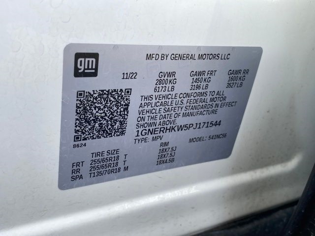 1st & 2nd Row All-Weather Floor Liner (LPO), 3.49 Axle Ratio, 3rd Row All-Weather Floor Liner (LPO), 3rd row seats: split-bench, 4-Wheel Disc Brakes, 6 Speakers, 6-Speaker Audio System Feature, 6-Way Power Front Passenger Seat, 8-Way Power Driver Seat Adjuster, ABS brakes, Air Conditioning, Alloy wheels, AM/FM radio: SiriusXM with 360L, Apple CarPlay/Android Auto, Auto High-beam Headlights, Automatic temperature control, Black Bowtie, Black Roof Rails, Brake assist, Bumpers: body-color, Compass, Delay-off headlights, Driver door bin, Driver vanity mirror, Dual front impact airbags, Dual front side impact airbags, Electronic Stability Control, Emergency communication system, Exterior Parking Camera Rear, Floor Liner Package (LPO), Four wheel independent suspension, Front anti-roll bar, Front Bucket Seats, Front Center Armrest, Front dual zone A/C, Front Passenger 2-Way Power Lumbar, Front reading lights, Fully automatic headlights, Garage door transmitter, Heated door mirrors, Heated Driver & Front Passenger Seats, Heated front seats, Heated steering wheel, Illuminated entry, Integrated Cargo Liner (LPO), Leather steering wheel, Leather-Appointed Seat Trim, Low tire pressure warning, Not Equipped w/Rear Park Assist (060), Occupant sensing airbag, Outside temperature display, Overhead airbag, Overhead console, Panic alarm, Passenger door bin, Passenger vanity mirror, Power door mirrors, Power Driver Lumbar Control, Power driver seat, Power Liftgate, Power passenger seat, Power steering, Power windows, Preferred Equipment Group 3LT, Premium audio system: Chevrolet Infotainment 3 Plus, Radio data system, Radio: Chevrolet Infotainment 3 Plus System, Rear air conditioning, Rear anti-roll bar, Rear reading lights, Rear window defroster, Rear window wiper, Remote keyless entry, Security system, SiriusXM w/360L, Speed control, Speed-sensing steering, Spoiler, Steering wheel mounted audio controls, Tachometer, Telescoping steering wheel, Tilt steering wheel, Traction control, Trip computer, Turn signal indicator mirrors, Variably intermittent wipers, Voltmeter, Wheels: 18" Bright Silver-Painted Aluminum.