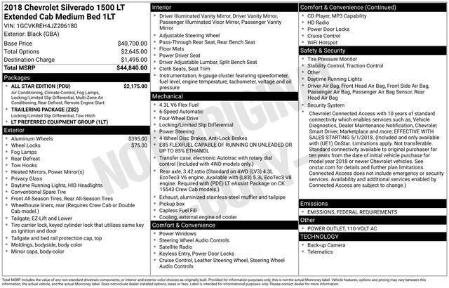 10-Way Power Driver's Seat Adjuster, 110-Volt AC Power Outlet, 150 Amp Alternator, 3.42 Rear Axle Ratio, 4-Wheel Disc Brakes, 4.2" Diagonal Color Display Driver Info Center, 40/20/40 Front Split Bench Seat, 6 Speaker Audio System, 6 Speakers, ABS brakes, Air Conditioning, All Star Edition, Alloy wheels, AM/FM radio: SiriusXM, Bluetooth® For Phone, Body Color Bodyside Moldings, Body-Color Door Handles, Body-Color Mirror Caps, Body-Color Power Adjustable Heated Outside Mirrors, Bodyside moldings, Brake assist, CD player, Chevrolet Connected Access, Chevrolet w/4G LTE, Cloth Seat Trim, Color-Keyed Carpeting w/Rubberized Vinyl Floor Mats, Compass, Deep-Tinted Glass, Delay-off headlights, Driver & Front Passenger Illuminated Vanity Mirrors, Driver door bin, Driver vanity mirror, Dual front impact airbags, Dual front side impact airbags, Dual-Zone Automatic Climate Control, E85 FlexFuel Capable, Electric Rear-Window Defogger, Electronic Stability Control, Exterior Parking Camera Rear, EZ Lift & Lower Tailgate, Front anti-roll bar, Front Center Armrest w/Storage, Front Chrome Bumper, Front reading lights, Front wheel independent suspension, Fully automatic headlights, HD Radio, Heated door mirrors, Heavy-Duty Rear Locking Differential, High-Intensity Discharge Headlights, Illuminated entry, Leather Wrapped Steering Wheel w/Cruise Controls, Low tire pressure warning, Manual Tilt Wheel Steering Column, Occupant sensing airbag, OnStar & Chevrolet Connected Services Capable, Outside temperature display, Overhead airbag, Overhead console, Panic alarm, Passenger door bin, Passenger vanity mirror, Power door mirrors, Power steering, Power windows, Power Windows w/Driver Express Up, Premium audio system: Chevrolet MyLink, Radio data system, Radio: AM/FM 8" Diagonal Color Touch Screen, Rear 60/40 Folding Bench Seat (Folds Up), Rear Chrome Bumper, Rear reading lights, Rear step bumper, Rear Wheelhouse Liners, Remote Keyless Entry, Remote keyless entry, Remote Locking Tailgate, Remote Vehicle Starter System, Single Slot CD/MP3 Player, SiriusXM Satellite Radio, Speed control, Speed-sensing steering, Split folding rear seat, Steering Wheel Audio Controls, Steering wheel mounted audio controls, Tachometer, Theft Deterrent System (Unauthorized Entry), Thin Profile LED Fog Lamps, Tilt steering wheel, Traction control, Trailering Package, Trip computer, Variably intermittent wipers, Voltmeter, Wheel Locks (Set of 4) (LPO).