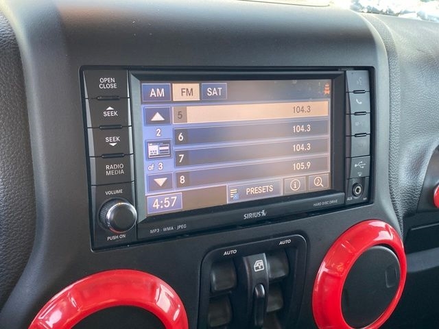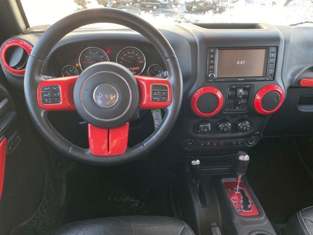 17" x 7.5" Polished Mineral Gray Wheels, 3.73 Rear Axle Ratio, 4-Wheel Disc Brakes, 40GB Hard Drive w/20GB Available, 5-Year SIRIUSXM Traffic Service, 5-Year SIRIUSXM Travel Link Service, 8 Speakers, ABS brakes, Accent Stitching, Air Conditioning, Air Conditioning w/Auto Temperature Control, Air Filtering, Alloy wheels, Alpine 9-Speaker w/All Weather Subwoofer, AM/FM radio, Audio Jack Input for Mobile Devices, Auto-dimming Rear-View mirror, Black 3-Piece Hard Top, Black/Chrome Screws Fuel Filler Door, Brake assist, CD player, Chrome/Leather Wrapped Shift Knob, Cloth Bucket Seats, Compass, Connectivity Group, Delete Sunrider Soft Top, Driver door bin, Driver Height Adjuster Seat, Driver vanity mirror, Dual front impact airbags, Electronic Stability Control, Freedom Panel Storage Bag, Front anti-roll bar, Front Bucket Seats, Front Center Armrest w/Storage, Front fog lights, Front reading lights, Front Seat Back Map Pockets, Fully automatic headlights, Heated door mirrors, Heated Front Seats, Hood w/Power Dome, Humidity Sensor, Illuminated entry, Integrated roll-over protection, Integrated Voice Command w/Bluetooth, Leather steering wheel, Leather Trimmed Bucket Seats, Leather Wrapped Steering Wheel, Low Gloss Black Wrangler Decal, Low tire pressure warning, MOPAR Dealer Installed Tow Strap Kit, MOPAR Slush Mats, Occupant sensing airbag, Outside temperature display, Panic alarm, Passenger door bin, Passenger vanity mirror, Performance Suspension, Power door mirrors, Power steering, Power windows, Premium Black Sunrider Soft Top, Premium EVIC Message Center, Quick Order Package 24J Rubicon Hard Rock, Radio data system, Radio: Uconnect 130 AM/FM/CD/MP3, Radio: Uconnect 730N CD/DVD/MP3/HDD/NAV, Rear anti-roll bar, Rear Window Defroster, Rear Window Wiper/Washer, Red Front & Rear Tow Hooks, Red Trail Rated Badge, Remote keyless entry, Remote Start System, Remote USB Port, Rubicon Hard Rock Package, Rubicon Hood Decal, Security system, Silver Interior Accents, SIRIUSXM Traffic, SIRIUSXM Travel Link, Speed control, Split folding rear seat, Steel Front Bumper, Steel Rear Bumper, Steering wheel mounted audio controls, Sunrider Soft Top, Supplemental Front Seat Side Airbags, Tachometer, Tilt steering wheel, Tire Pressure Monitoring Display, Traction control, Trip computer, Uconnect Voice Command w/Bluetooth, Variably intermittent wipers, Vehicle Information Center, Wheels: 17" x 7.5" Polished Semi-Gloss Black.