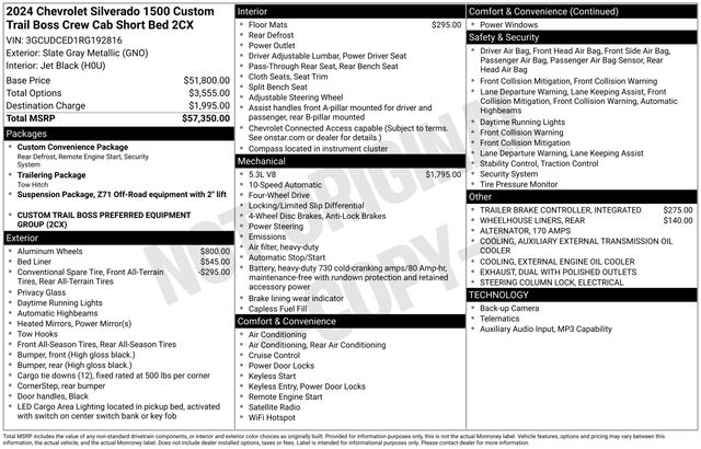 Custom Convenience Package, Electric Rear-Window Defogger, EZ Lift Power Lock & Release Tailgate, Heavy-Duty Air Filter, Hill Descent Control, LED Cargo Area Lighting, Remote Vehicle Starter System, Suspension Package, Theft Deterrent System (Unauthorized Entry), 10-Way Power Driver Seat w/Lumbar, 120-Volt Bed Mounted Power Outlet, 120-Volt Interior Power Outlet, 170 Amp Alternator, 220 Amp Alternator, 3.5" Monochromatic Display Driver Info Center, 4-Wheel Disc Brakes, 40/20/40 Front Split-Bench Seat, 6 Speakers, 6-Speaker Audio System, ABS brakes, Air Conditioning, All-Weather Floor Liner (LPO) (AAK), Alloy wheels, AM/FM radio: SiriusXM, Auto High-beam Headlights, Auto-Locking Rear Differential, Automatic Emergency Braking, Auxiliary External Transmission Oil Cooler, Bluetooth® For Phone, Brake assist, Chevrolet Connected Access Capable, Chevytec Spray-On Black Bedliner, Cloth Seat Trim, Color-Keyed Carpeting Floor Covering, Compass, Deep-Tinted Glass, Delay-off headlights, Driver door bin, Driver vanity mirror, Dual Exhaust w/Polished Outlets, Dual front impact airbags, Dual front side impact airbags, Dual Rear USB Ports (Charge Only), Electrical Steering Column Lock, Electronic Cruise Control, Electronic Stability Control, External Engine Oil Cooler, Following Distance Indicator, Forward Collision Alert, Front anti-roll bar, Front Center Armrest w/Storage, Front Pedestrian Braking, Front reading lights, Front Rubberized Vinyl Floor Mats, Front wheel independent suspension, Fully automatic headlights, HD Rear Vision Camera, Heated door mirrors, Hitch Guidance, Illuminated entry, Integrated Trailer Brake Controller, IntelliBeam Automatic High Beam On/Off, Lane Keep Assist w/Lane Departure Warning, Low tire pressure warning, Manual Tilt Wheel Steering Column, Occupant sensing airbag, OnStar & Chevrolet Connected Services Capable, Outside temperature display, Overhead airbag, Overhead console, Panic alarm, Passenger door bin, Passenger vanity mirror, Performance Red Recovery Hooks, Power door mirrors, Power driver seat, Power Front Windows w/Driver Express Up/Down, Power Front Windows w/Passenger Express Down, Power Rear Windows w/Express Down, Power steering, Power windows, Preferred Equipment Group 2CX, Premium audio system: Chevrolet Infotainment 3, Radio data system, Radio: Chevrolet Infotainment 3 System, Rear 60/40 Folding Bench Seat (Folds Up), Rear reading lights, Rear Rubberized-Vinyl Floor Mats, Rear step bumper, Rear Wheelhouse Liners, Rear window defroster, Remote Keyless Entry, Remote keyless entry, Security system, Single Outlet Exhaust, SiriusXM Radio, Speed control, Speed-sensing steering, Split folding rear seat, Standard Tailgate, Tachometer, Tilt steering wheel, Traction control, Trailering Package, Trip computer, Variably intermittent wipers, Voltmeter, Wheels: 18" x 8.5" Black Painted Aluminum, Wheels: 20" x 9" High Gloss Black Painted Alum, Wi-Fi Hot Spot Capable, Custom Convenience Package, Electric Rear-Window Defogger, EZ Lift Power Lock & Release Tailgate, Heavy-Duty Air Filter, Hill Descent Control, LED Cargo Area Lighting, Remote Vehicle Starter System, Suspension Package, Theft Deterrent System (Unauthorized Entry).