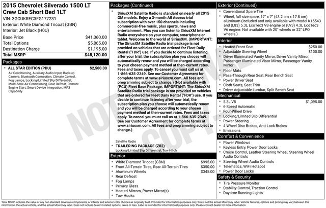 110-Volt AC Power Outlet, All Star Edition, Dual-Zone Automatic Climate Control, Electric Rear-Window Defogger, Front Halogen Fog Lamps, Radio: AM/FM 8" Diagonal Color Touch Screen, Rear Vision Camera w/Dynamic Guide Lines, Remote Vehicle Starter System, Trailering Equipment, 10-Way Power Driver's Seat Adjuster, 150 Amp Alternator, 3.42 Rear Axle Ratio, 4-Wheel Disc Brakes, 4.2" Diagonal Color Display Driver Info Center, 40/20/40 Front Split Bench Seat, 6 Speaker Audio System, 6 Speakers, ABS brakes, Air Conditioning, Alloy wheels, AM/FM radio: SiriusXM, Auxiliary External Transmission Oil Cooler, Bluetooth® For Phone, Body Color Bodyside Moldings, Body Color Door Handles, Body-Color Mirror Caps, Body-Color Power Adjustable Heated Outside Mirrors, Bodyside moldings, Brake assist, Bumpers: chrome, CD player, Cloth Seat Trim, Color-Keyed Carpeting w/Rubberized Vinyl Floor Mats, Compass, Deep-Tinted Glass, Delay-off headlights, Driver & Front Passenger Illuminated Vanity Mirrors, Driver door bin, Driver vanity mirror, Dual front impact airbags, Dual front side impact airbags, Electronic Stability Control, Emergency communication system: OnStar Directions & Connections, EZ Lift & Lower Tailgate, Front anti-roll bar, Front Center Armrest w/Storage, Front Chrome Bumper, Front reading lights, Front wheel independent suspension, Fully automatic headlights, Heated door mirrors, Heated Driver & Front Passenger Seats, Heavy-Duty Rear Locking Differential, Illuminated entry, Integrated Trailer Brake Controller, Leather Wrapped Steering Wheel w/Cruise Controls, Low tire pressure warning, Manual Tilt Wheel Steering Column, Manual Tilt/Telescoping Steering Column, Occupant sensing airbag, OnStar 6 Months Directions & Connections Plan, OnStar w/4G LTE, Outside temperature display, Overhead airbag, Overhead console, Panic alarm, Passenger door bin, Passenger vanity mirror, Power door mirrors, Power steering, Power windows, Power Windows w/Driver Express Up, Premium audio system: Chevrolet MyLink, Radio data system, Radio: AM/FM Audio System w/Chevrolet MyLink, Rear 60/40 Folding Bench Seat (Folds Up), Rear Chrome Bumper, Rear reading lights, Rear seat center armrest, Rear step bumper, Rear Wheelhouse Liners, Remote Keyless Entry, Remote keyless entry, Single Slot CD/MP3 Player, SiriusXM Satellite Radio, Speed control, Speed-sensing steering, Split folding rear seat, Steering Wheel Audio Controls, Steering wheel mounted audio controls, Tachometer, Theft Deterrent System (Unauthorized Entry), Tilt steering wheel, Traction control, Trip computer, Variably intermittent wipers, Voltmeter, Wheels: 17" x 8" Bright Machined Aluminum, 110-Volt AC Power Outlet, All Star Edition, Dual-Zone Automatic Climate Control, Electric Rear-Window Defogger, Front Halogen Fog Lamps, Radio: AM/FM 8" Diagonal Color Touch Screen, Rear Vision Camera w/Dynamic Guide Lines, Remote Vehicle Starter System, Trailering Equipment.