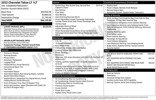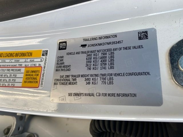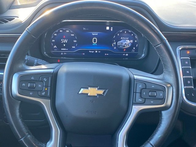 10-Way Power Driver & Passenger Seat Adjusters, 1st & 2nd Row Color-Keyed Carpeted Floor Mats, 2nd Row Pwr Release 60/40 Split-Folding Bench Seat, 3.23 Rear Axle Ratio, 3rd Row 60/40 Power-Folding Split-Bench Seat, 3rd row seats: split-bench, 4-Wheel Disc Brakes, 9 Speakers, ABS brakes, Air Conditioning, Alloy wheels, AM/FM radio: SiriusXM with 360L, Apple CarPlay/Android Auto, Auto High-beam Headlights, Auto-Dimming Inside Rear-View Mirror, Auto-dimming Rear-View mirror, Automatic Stop/Start, Automatic temperature control, Bose 9-Speaker Stereo Audio System Feature, Brake assist, Bright Front & Rear Door Sill Plates, Bumpers: body-color, Color-Keyed Carpeting Floor Covering, Compass, Delay-off headlights, Driver & Front Outboard Passenger Airbags, Driver Alert Package, Driver door bin, Driver vanity mirror, Dual front impact airbags, Dual front side impact airbags, Electronic Stability Control, Emergency communication system: OnStar and Chevrolet connected services capable, Enhanced Driver Information Center, Floor Console w/Storage Area, Four wheel independent suspension, Front & Rear Black Bowtie Emblems (LPO), Front anti-roll bar, Front Bucket Seats, Front Center Armrest, Front dual zone A/C, Front High-Back Reclining Bucket Seats, Front reading lights, Fully automatic headlights, Garage door transmitter, Hands-Free Rear Power Programmable Liftgate, HD Surround Vision, Heated 2nd Row Outboard Seats, Heated door mirrors, Heated Driver & Front Passenger Seats, Heated front seats, Heated Steering Wheel, Illuminated entry, Infotainment Display, Lane Change Alert w/Side Blind Zone Alert, Leather steering wheel, Leather-Appointed Seat Trim, Leather-Wrapped Steering Wheel, LED Daytime Running Lamps, Low tire pressure warning, Luxury Package, Memory seat, Memory Settings, Memory Settings for Driver, Navigation System, Not Equipped w/Front & Rear Park Assist, Not Equipped w/Steering Column Lock, Occupant sensing airbag, Outside Heated Power-Adjustable Mirrors, Outside temperature display, Overhead airbag, Overhead console, Panic alarm, Passenger door bin, Passenger vanity mirror, Power door mirrors, Power driver seat, Power Liftgate, Power passenger seat, Power Release 2nd Row Bucket Seats, Power steering, Power Tilt & Telescopic Steering Column, Power windows, Preferred Equipment Group 1LT, Premium audio system: Chevrolet Infotainment System 3, Premium Smooth Ride Suspension, Radio: Chevrolet Infotainment 3 Premium System, Rain sensing wipers, Rear air conditioning, Rear anti-roll bar, Rear Cross Traffic Alert, Rear Pedestrian Alert, Rear reading lights, Rear seat center armrest, Rear window defroster, Rear window wiper, Remote keyless entry, Remote Start, Roof rack: rails only, Security system, SiriusXM Radio w/360L, Speed control, Speed-sensing steering, Split folding rear seat, Spoiler, Start/Stop System Disable Button, Steering wheel mounted audio controls, Tachometer, Telescoping steering wheel, Tilt steering wheel, Traction control, Trip computer, Universal Home Remote, Variably intermittent wipers, Voltmeter, Wheels: 18" x 8.5" Bright Silver Painted Aluminum, Wheels: 20" x 9" Painted Aluminum, Wireless Charging.