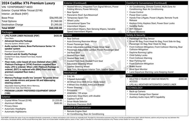 Automatic Emergency Braking, Bose Performance Series Audio System, Dual Driver Info Center Display Gauge Cluster, Front & Rear Park Assist, Inside Rear-View Auto-Dimming Mirror, Navigation System, Premium Luxury Package 1SD, Teen Driver, 14 Speakers, 1st, 2nd & 3rd Rows All-Weather Floor Liners (LPO), 2-Way Power Driver Lumbar Control Seat Adjuster, 2-Way Power Passenger Lumbar Control Seat Adjuster, 3.49 Axle Ratio, 3rd row seats: split-bench, 4-Wheel Disc Brakes, 8-Way Power Driver Seat Adjuster, ABS brakes, Air Conditioning, All-Weather Integrated Cargo Liner (LPO), Alloy wheels, AM/FM radio: SiriusXM with 360L, Audio memory, Auto High-beam Headlights, Auto tilt-away steering wheel, Auto-dimming door mirrors, Auto-dimming Rear-View mirror, Automatic Stop/Start w/Disable, Automatic temperature control, Brake assist, Bumpers: body-color, Compass, Delay-off headlights, Driver & Front Passenger Heated Seats, Driver door bin, Driver vanity mirror, Dual front impact airbags, Dual front side impact airbags, Electronic Stability Control, Emergency communication system: OnStar and Cadillac connected services capable, Floor Liner Package (LPO), Four wheel independent suspension, Front anti-roll bar, Front Bucket Seats, Front Center Armrest, Front dual zone A/C, Front reading lights, Fully automatic headlights, Garage door transmitter, Genuine wood dashboard insert, Genuine wood door panel insert, Heated door mirrors, Heated front seats, Heated rear seats, Heated steering wheel, Illuminated entry, Knee airbag, Leather Seating Surfaces w/Mini-Perforated Inserts, Leather steering wheel, Low tire pressure warning, Memory seat, Occupant sensing airbag, Outside temperature display, Overhead airbag, Overhead console, Panic alarm, Passenger door bin, Passenger vanity mirror, Power door mirrors, Power driver seat, Power Liftgate, Power moonroof: UltraView, Power passenger seat, Power steering, Power windows, Radio data system, Radio: Cadillac User Experience w/Embedded Nav, Rain sensing wipers, Rear air conditioning, Rear anti-roll bar, Rear reading lights, Rear seat center armrest, Rear window defroster, Rear window wiper, Remote keyless entry, Ride & Handling Suspension, Roof rack: rails only, Security system, SiriusXM w/360L, Speed control, Speed-sensing steering, Split folding rear seat, Spoiler, Steering wheel memory, Steering wheel mounted audio controls, Tachometer, Telescoping steering wheel, Tilt steering wheel, Traction control, Trip computer, Turn signal indicator mirrors, Variably intermittent wipers, Ventilated Driver & Front Passenger Seats, Ventilated front seats, Voltmeter, Wheels: 20" 12-Spoke Alloy w/Fully Polished Finish, Wheels: 20" 6-Split Spoke Alloy, Automatic Emergency Braking, Bose Performance Series Audio System, Dual Driver Info Center Display Gauge Cluster, Front & Rear Park Assist, Inside Rear-View Auto-Dimming Mirror, Navigation System, Premium Luxury Package 1SD, Teen Driver.